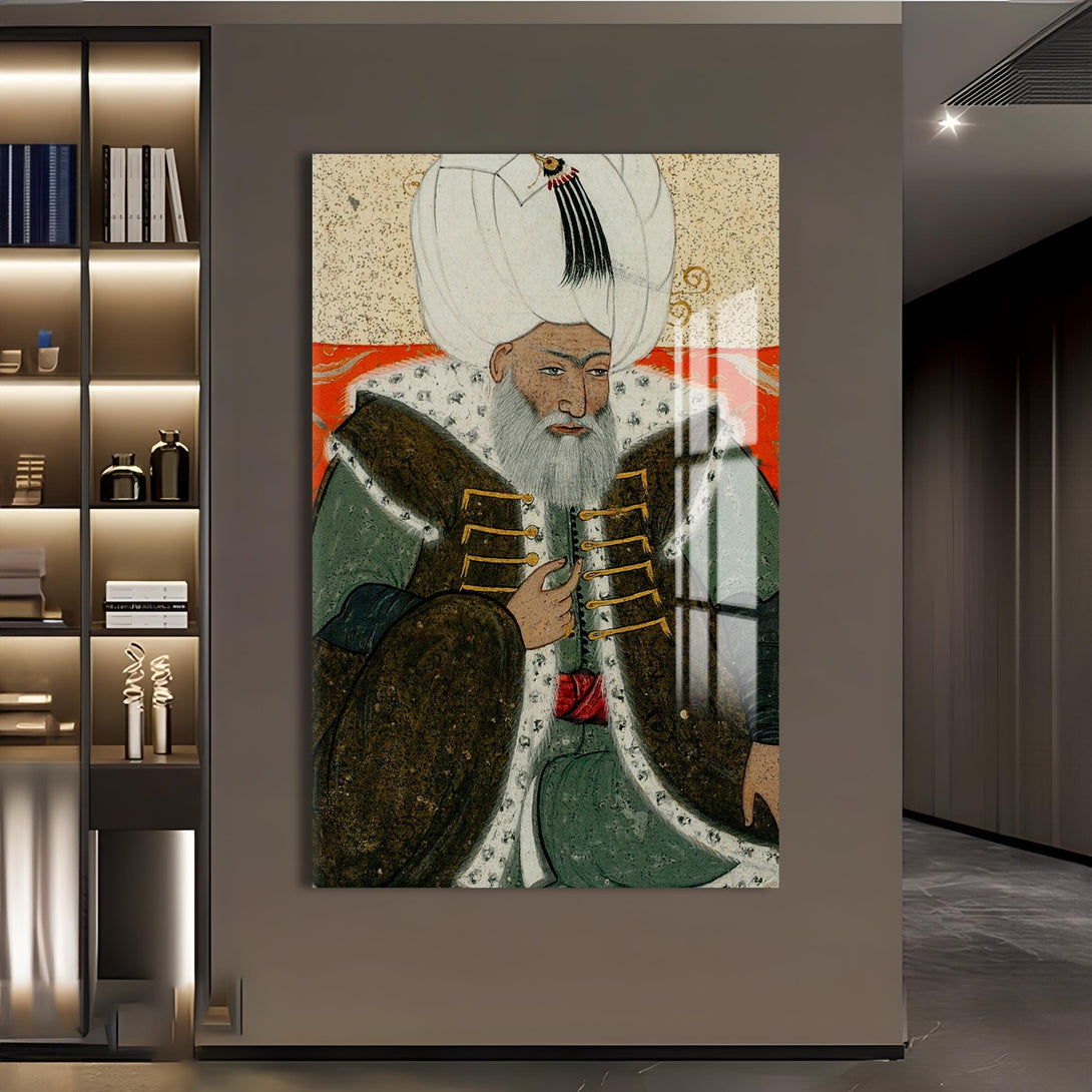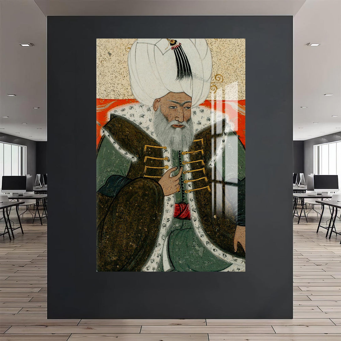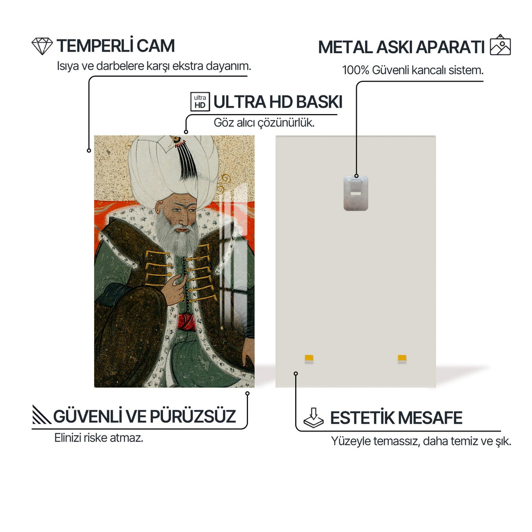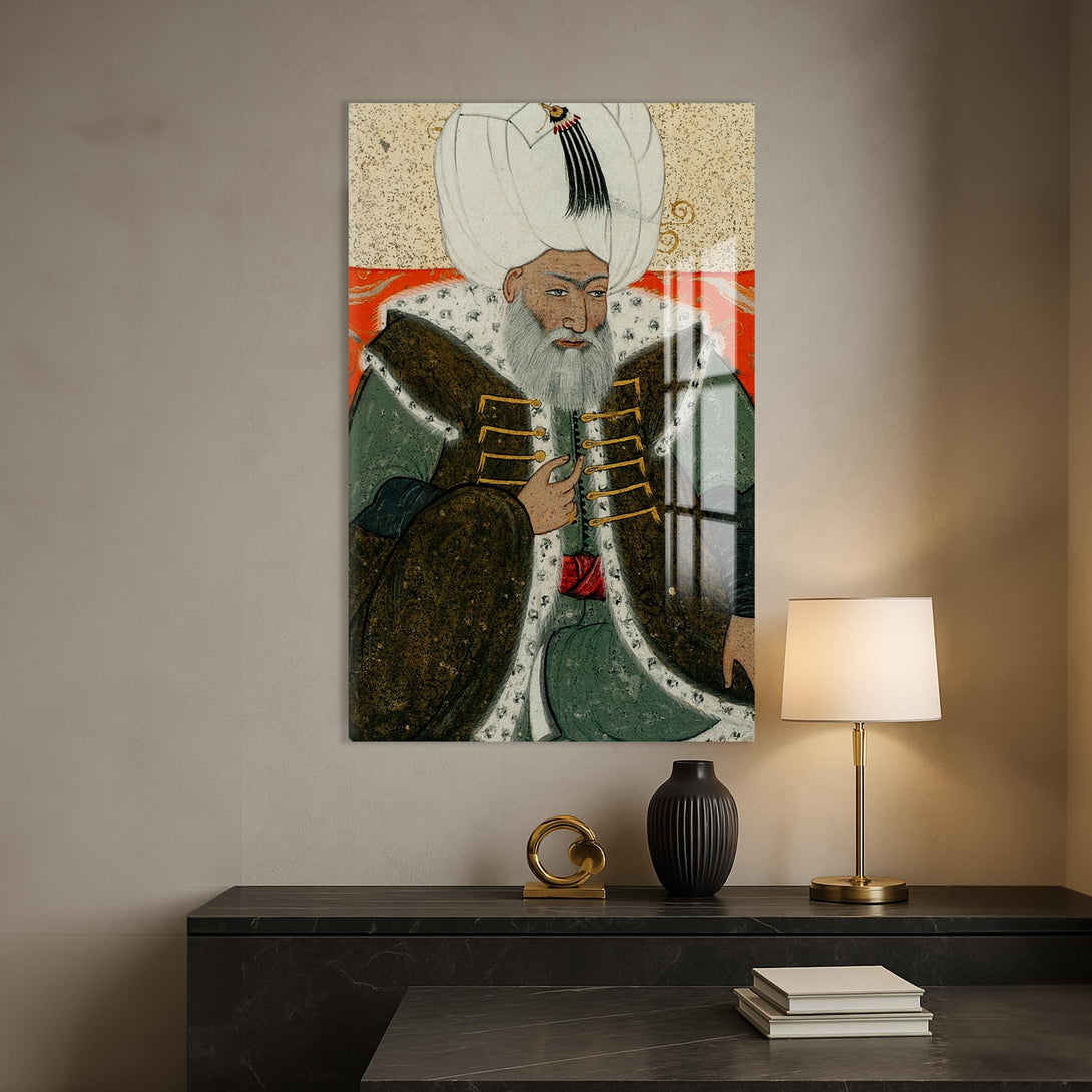 Minyatür tarzında işlenen bu cam tablo, Osmanlı tarihinin en sakin ve adaletli padişahlarından 2. Bayezid’in duruluğunu taşır. Tarihi zarafetle bütünleştirmek isteyenler için özel bir seçimdir.
