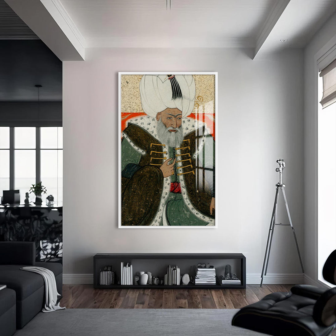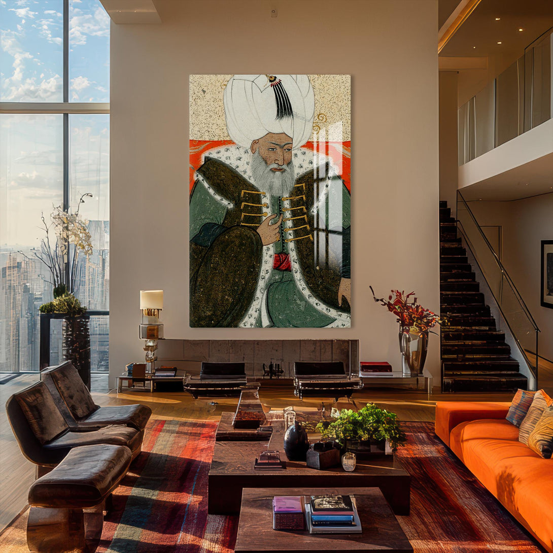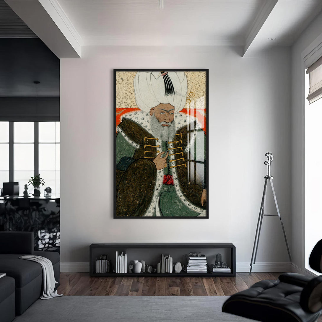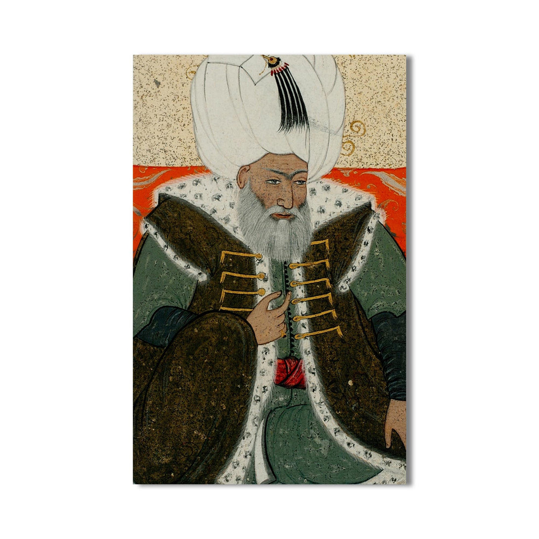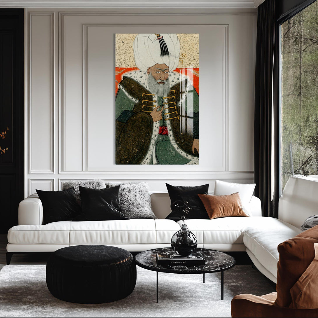 Minyatür tarzında işlenen bu cam tablo, Osmanlı tarihinin en sakin ve adaletli padişahlarından 2. Bayezid’in duruluğunu taşır. Tarihi zarafetle bütünleştirmek isteyenler için özel bir seçimdir.