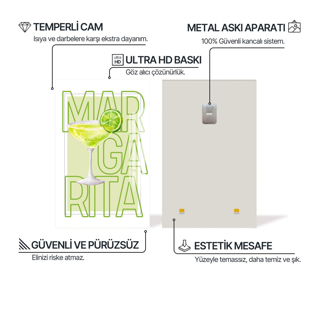 Lime ve tuz kenarıyla ikonik hale gelen Margarita kokteyli, bu canlı cam tablo tasarımıyla duvarlara neşe katıyor. Özellikle yazlık dekorlarda ve mutfak/bar alanlarında renkli bir ifade arayanlar için birebir. Alkollü içecekler koleksiyonunun vazgeçilmez üyelerinden biridir.