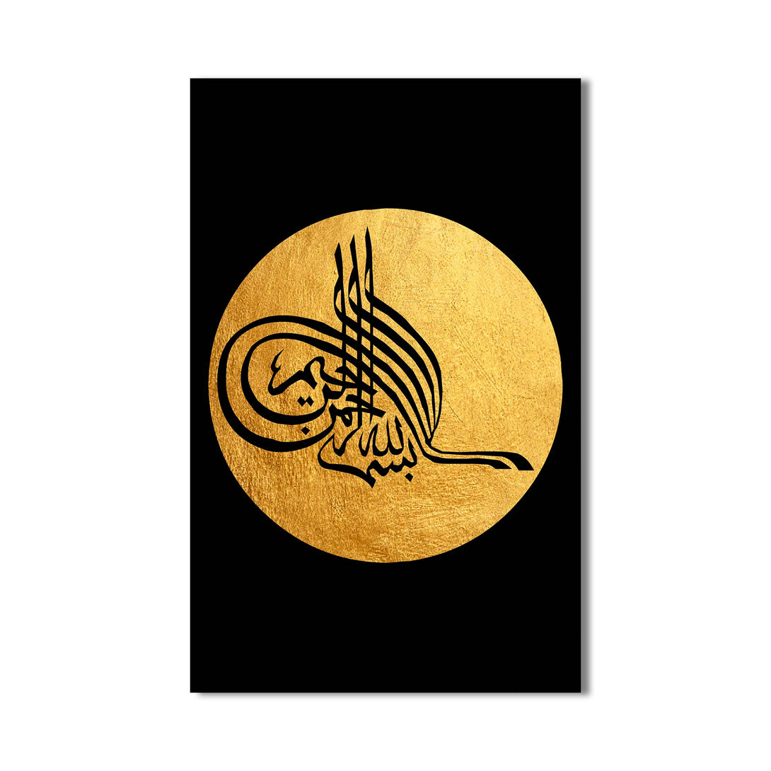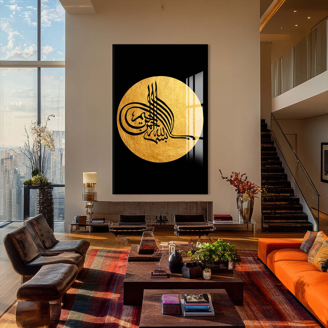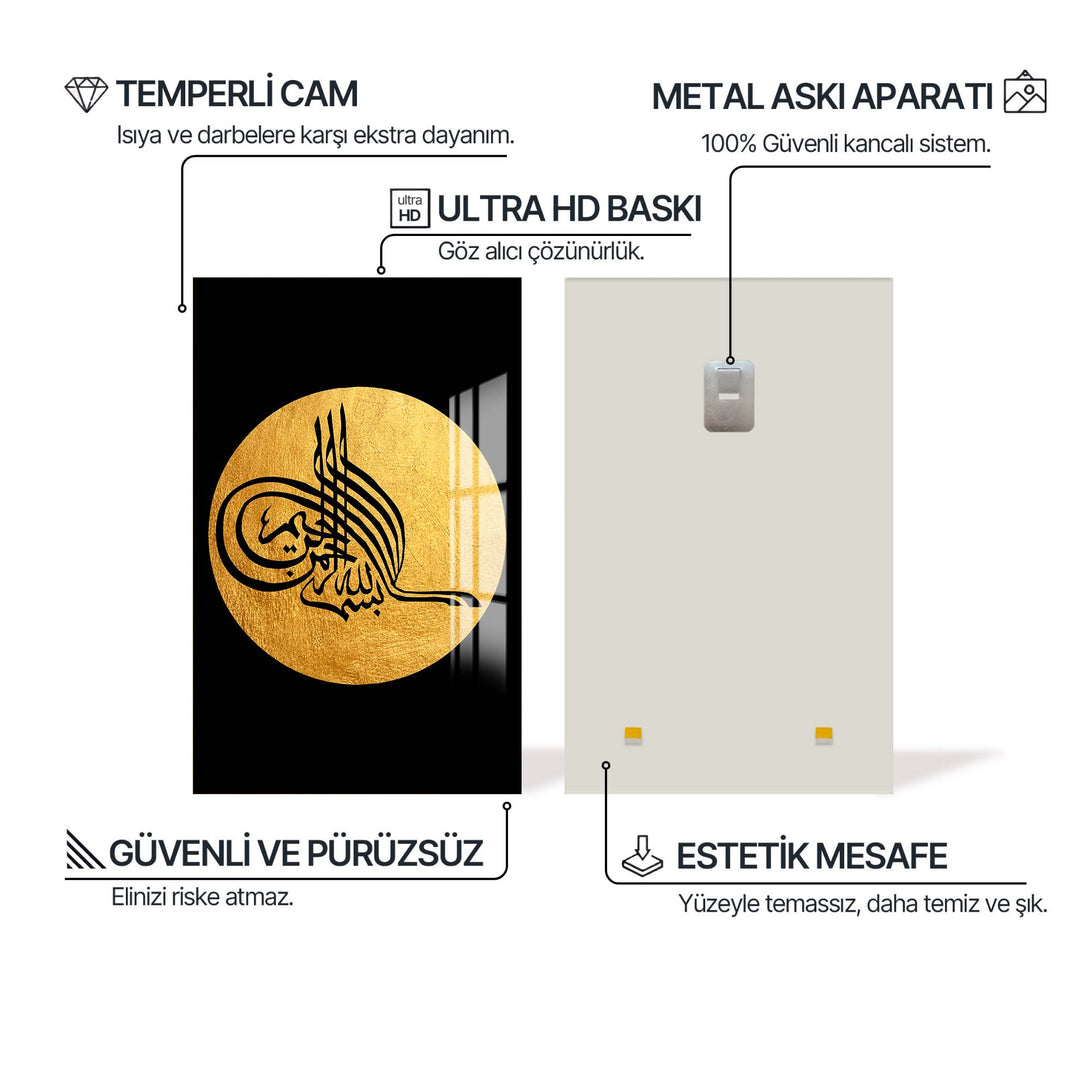 Altın zemin üzerine işlenmiş tuğra formundaki “Bismillahirrahmanirrahim”, bu özel cam tablo'da geleneksel ihtişamı günümüze taşıyor. Osmanlı zarafetini hat sanatına yansıtan bu eser, evinize ruhani bir başlangıç enerjisi katar.