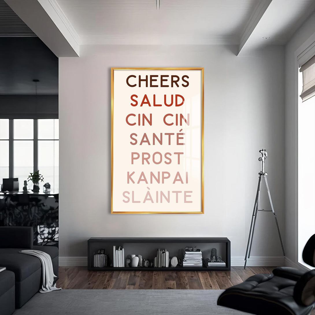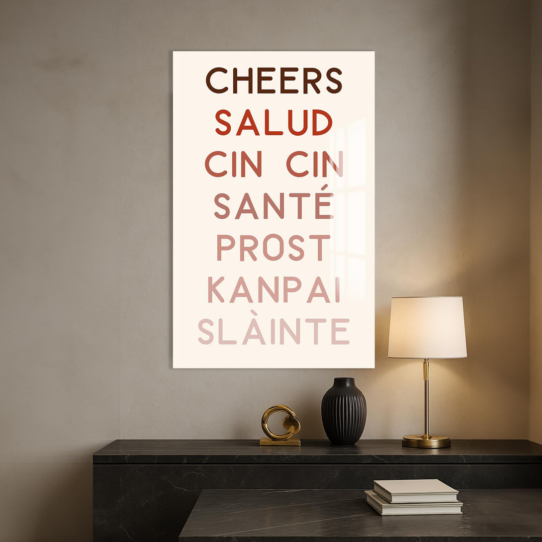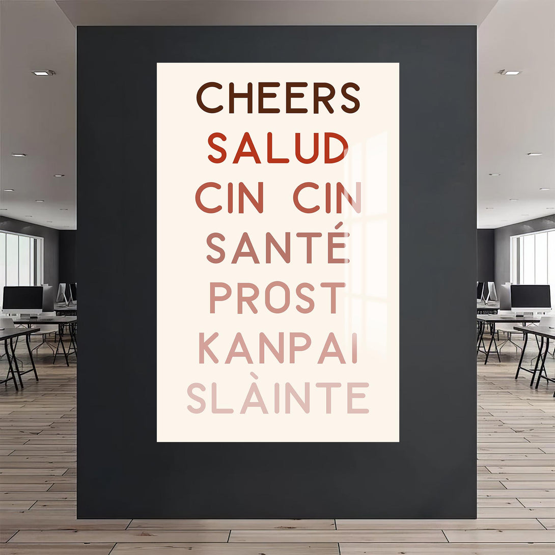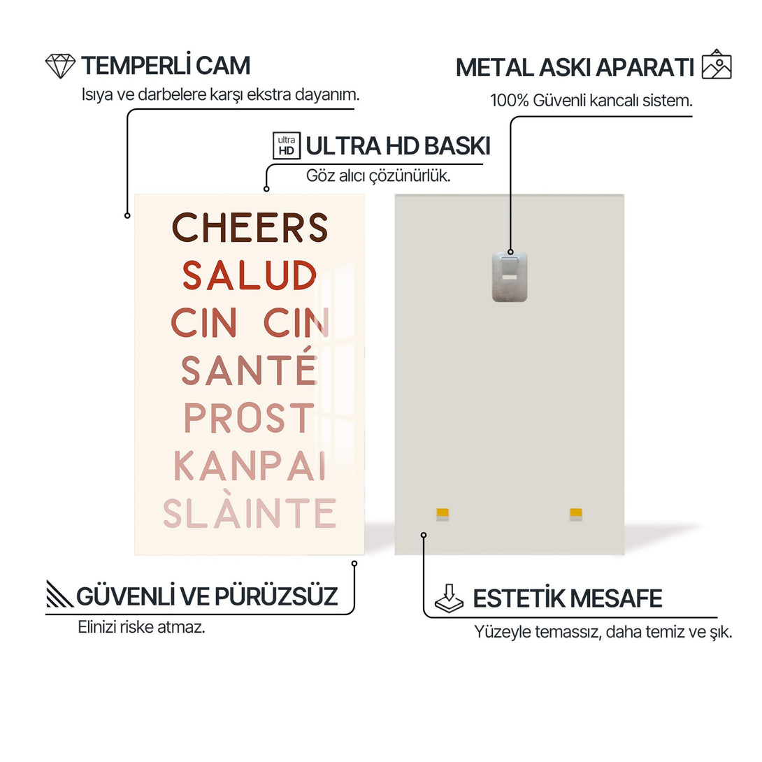 Farklı dillerde “şerefe” anlamına gelen ifadelerle tasarlanmış bu cam tablo, alkollü içecekler temasını global bir dilde yansıtıyor.