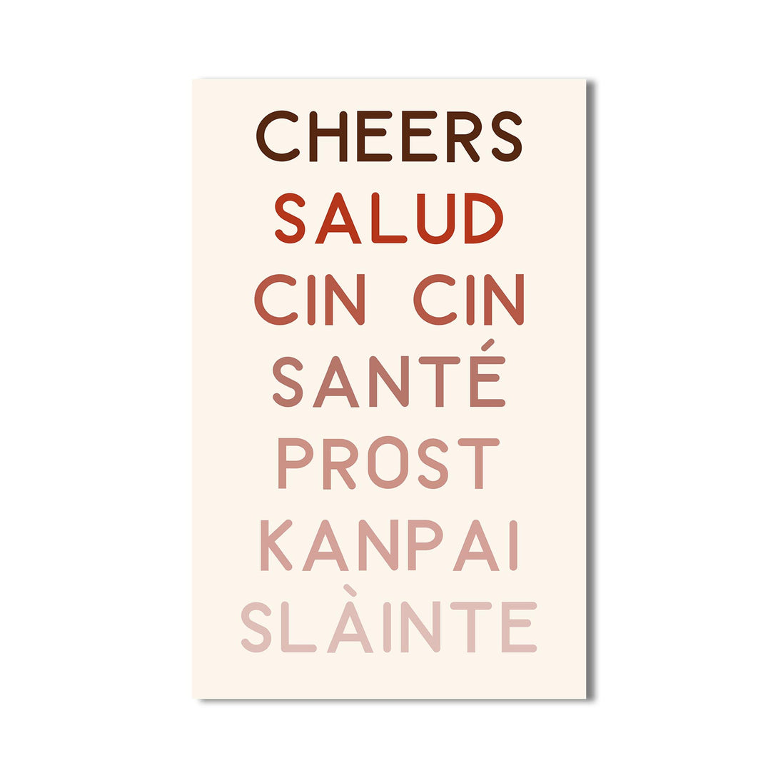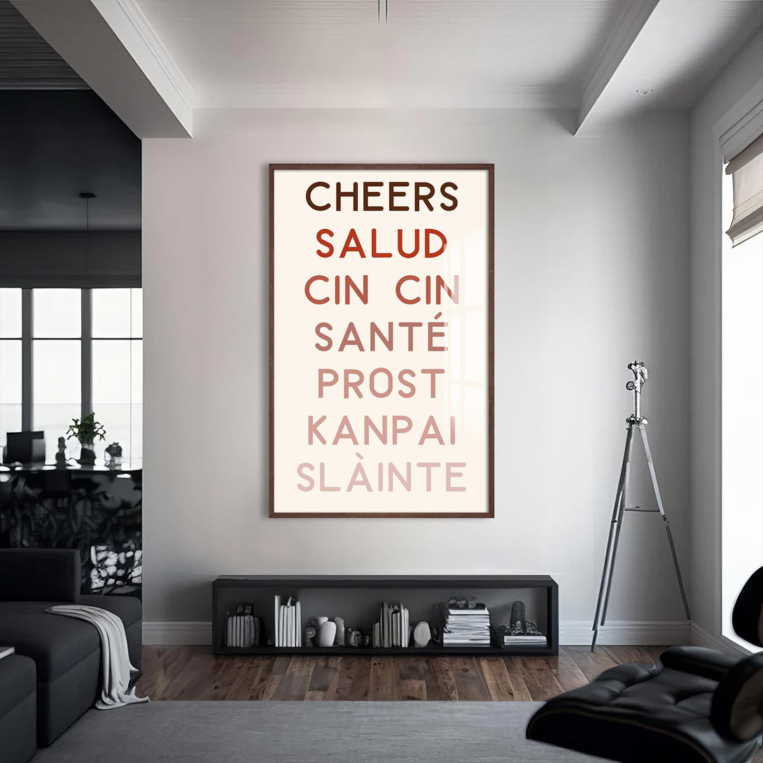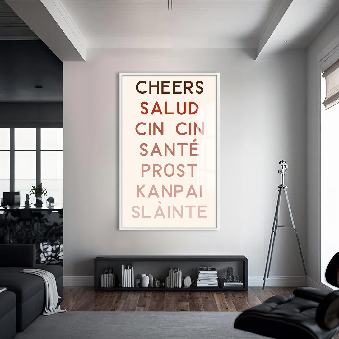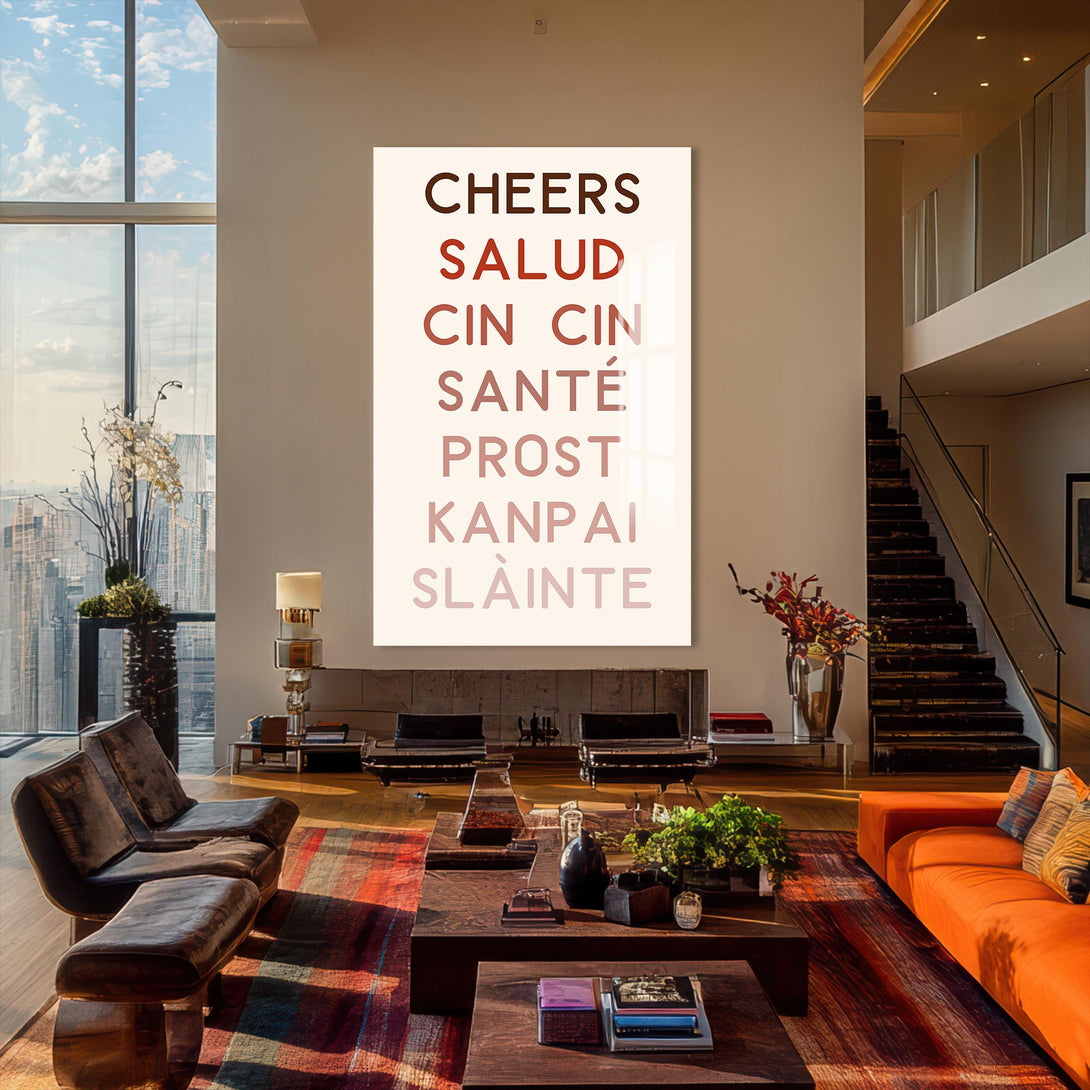 Farklı dillerde “şerefe” anlamına gelen ifadelerle tasarlanmış bu cam tablo, alkollü içecekler temasını global bir dilde yansıtıyor.