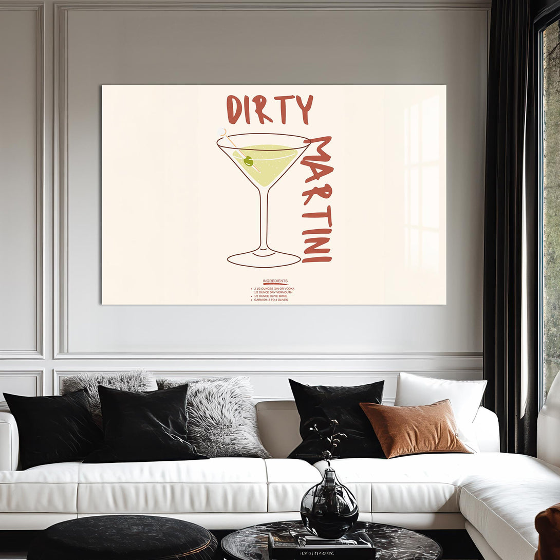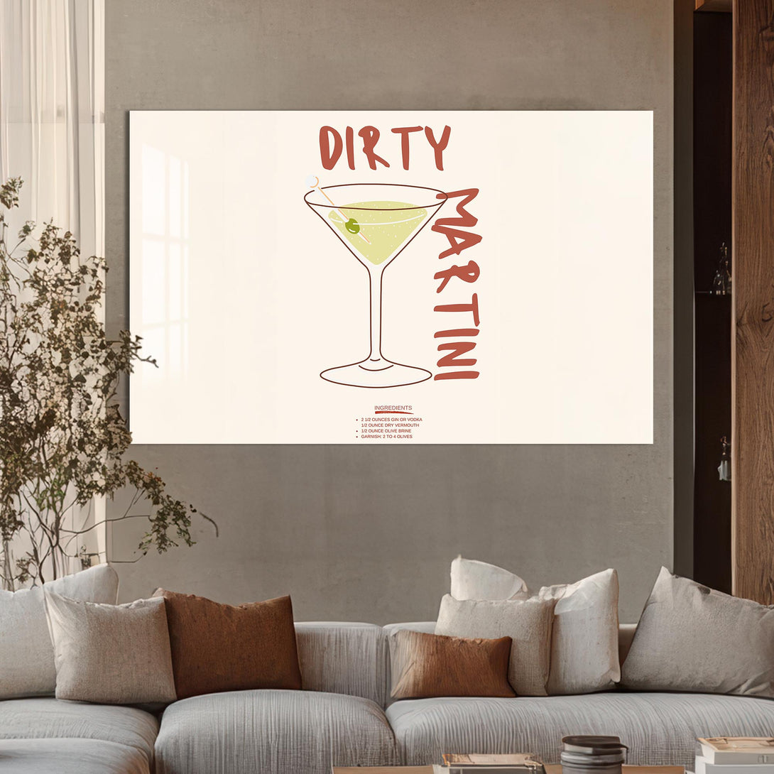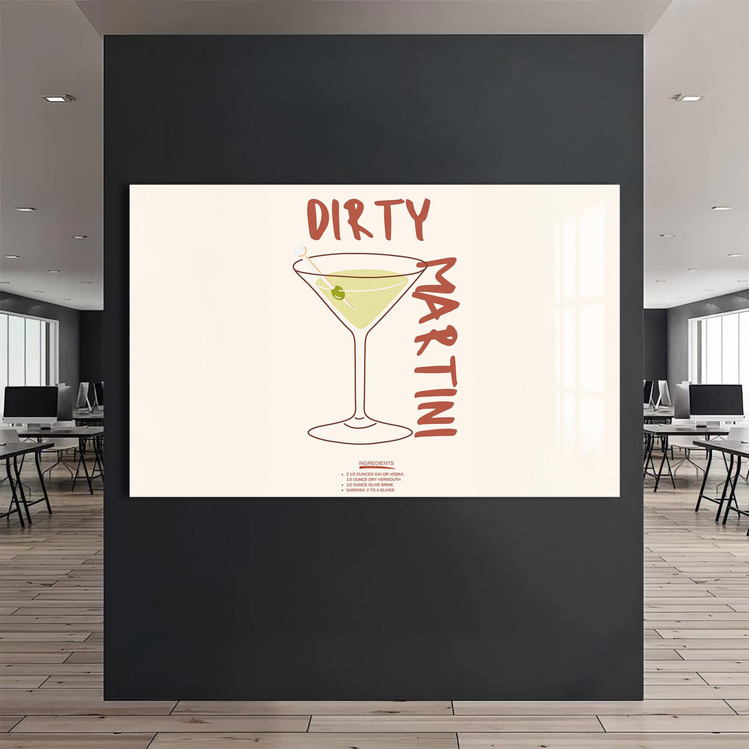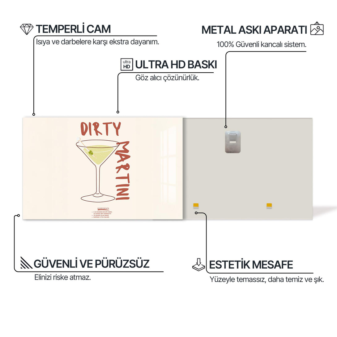 Zeytinli sunumuyla klasikleşmiş Dirty Martini’nin tarifini şık bir illüstrasyonla sunan bu "cam tablo", estetik ve bilgi odaklı bir tasarımdır. Alkollü içecekler kültürünü sevenler için mutfak, bar köşesi ya da salonlara ideal bir dokunuş sağlar.