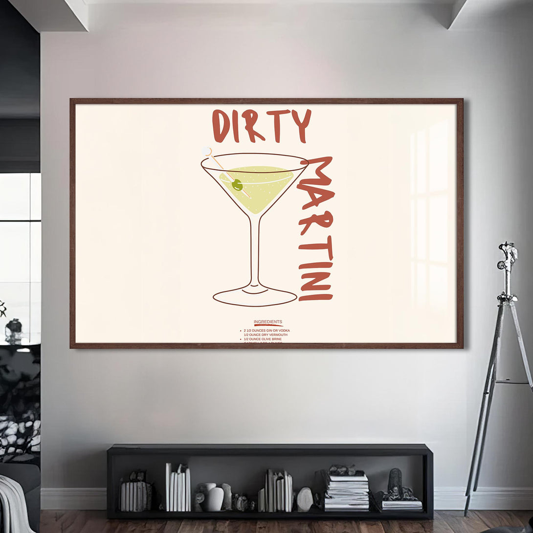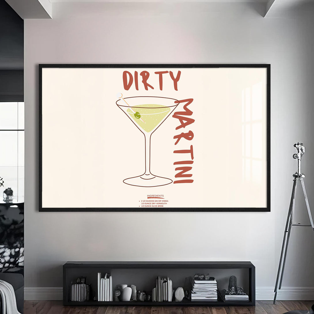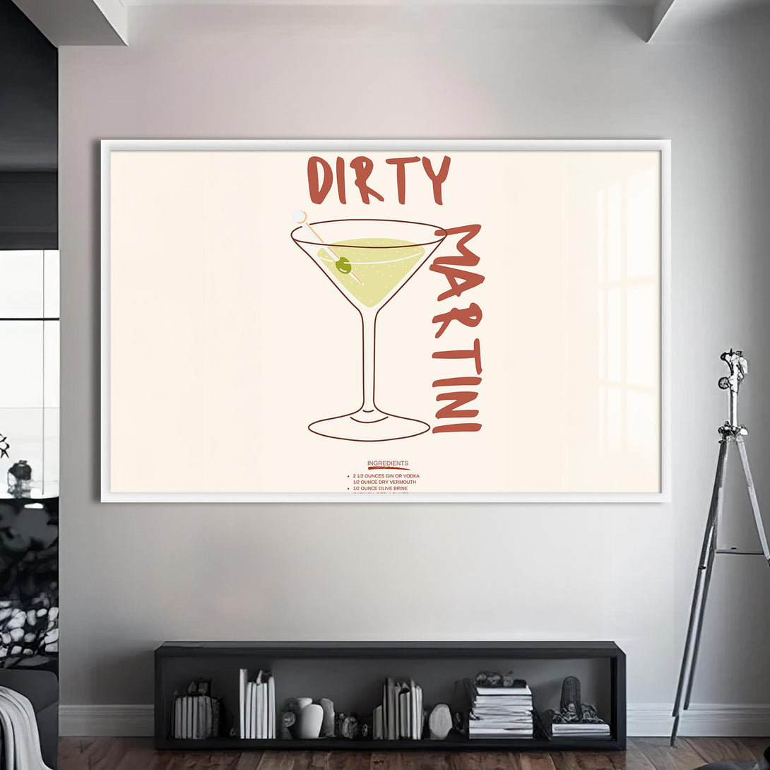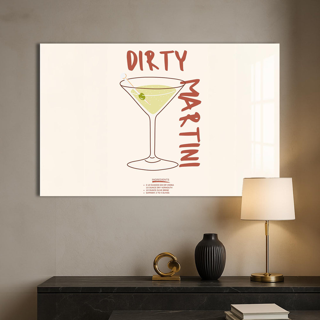 Zeytinli sunumuyla klasikleşmiş Dirty Martini’nin tarifini şık bir illüstrasyonla sunan bu "cam tablo", estetik ve bilgi odaklı bir tasarımdır. Alkollü içecekler kültürünü sevenler için mutfak, bar köşesi ya da salonlara ideal bir dokunuş sağlar.