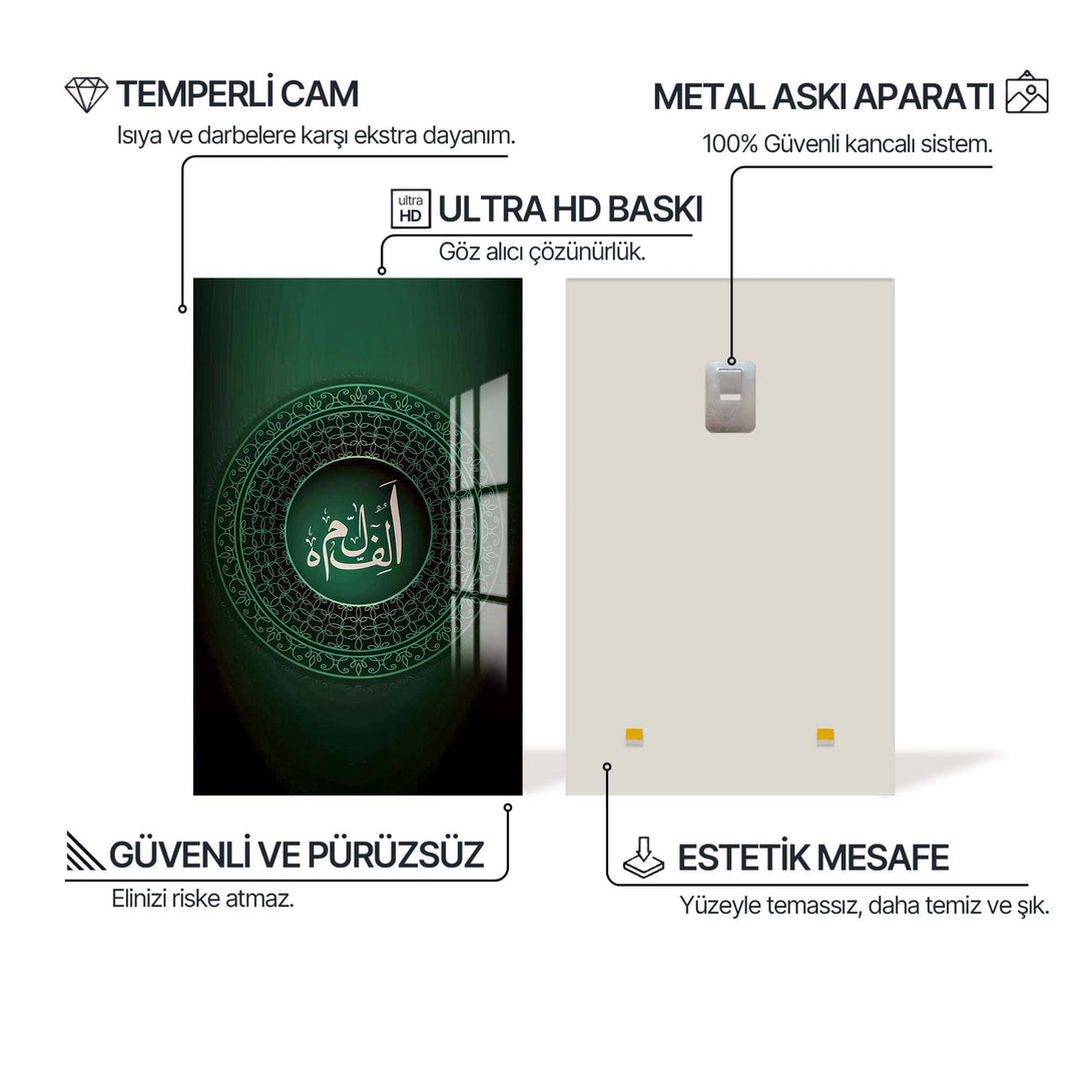 Fatiha Suresi'nin başlığı, yeşil arka planla huzur veren bir tasarıma dönüşüyor. Bu cam tablo, İslam’ın özünü yansıtan sade ve etkili bir parçadır.