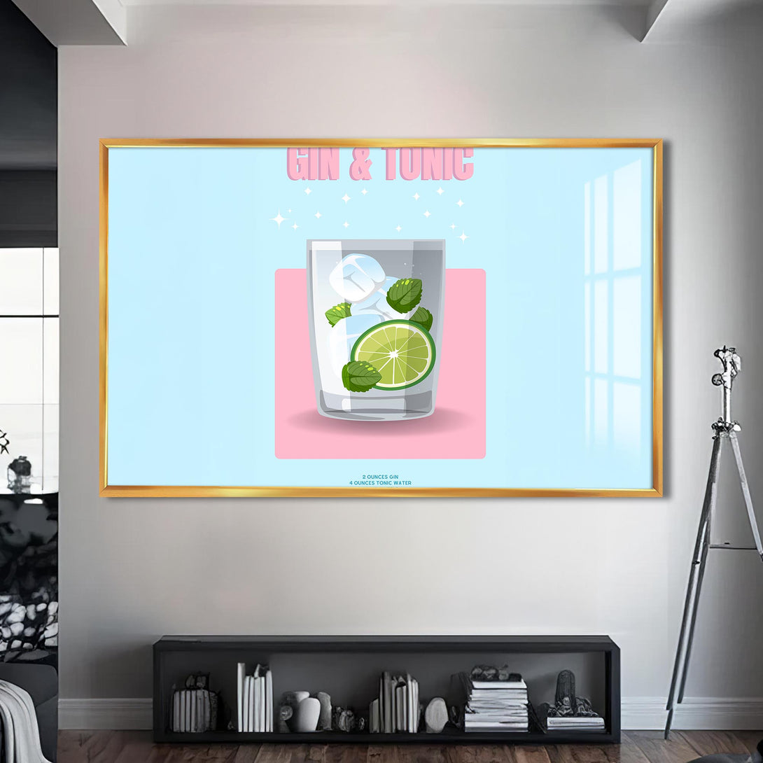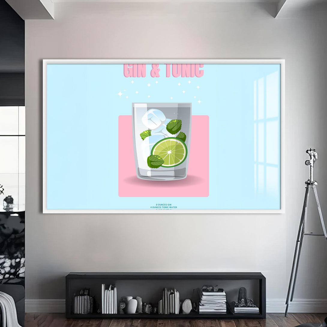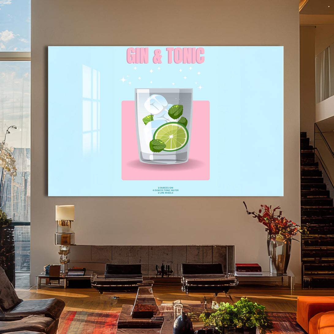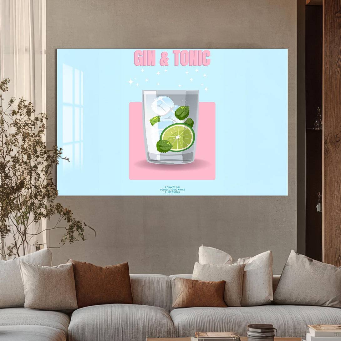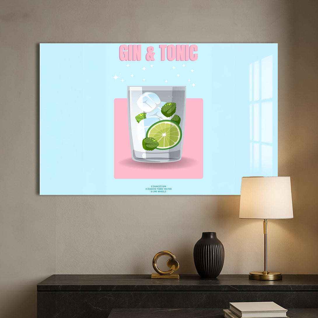 Pastel renkli zemin üzerinde narin bir bardak, lime dilimi ve nane yapraklarıyla sunulan klasik bir kokteyl: Gin & Tonic. Sadeliği ve modern tasarımıyla bu cam tablo, alkollü içecekler temalı koleksiyonlarda sade şıklığın temsilcisi.