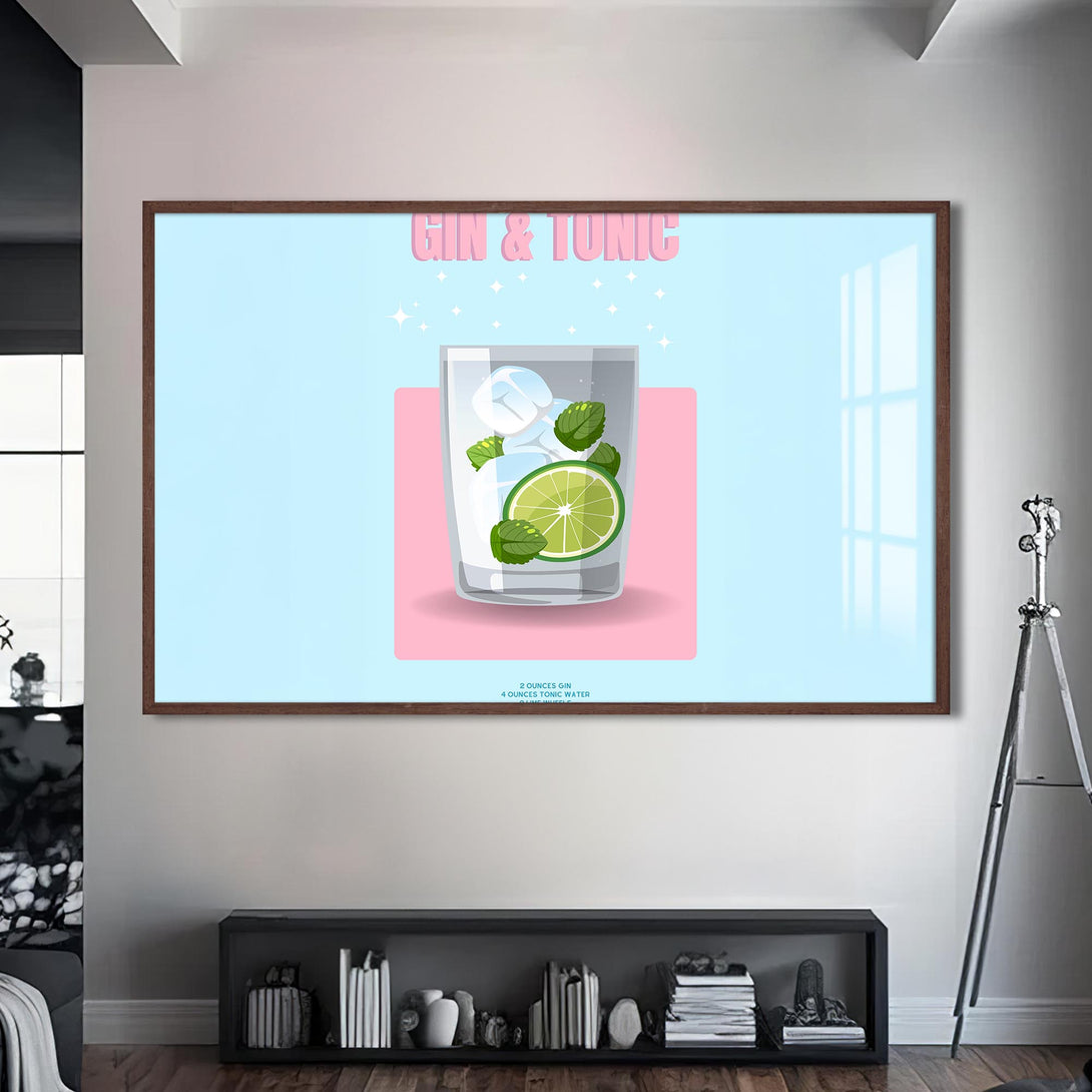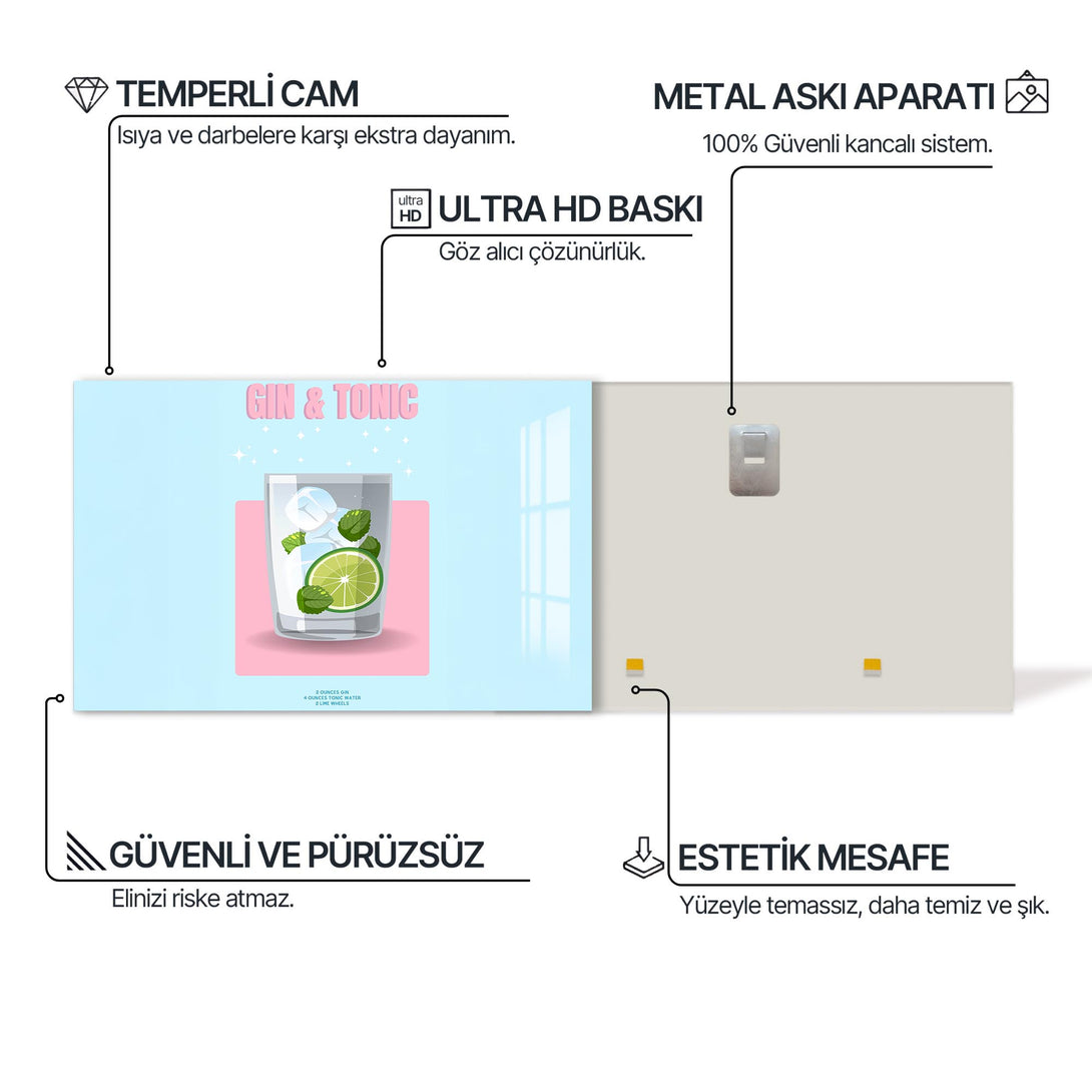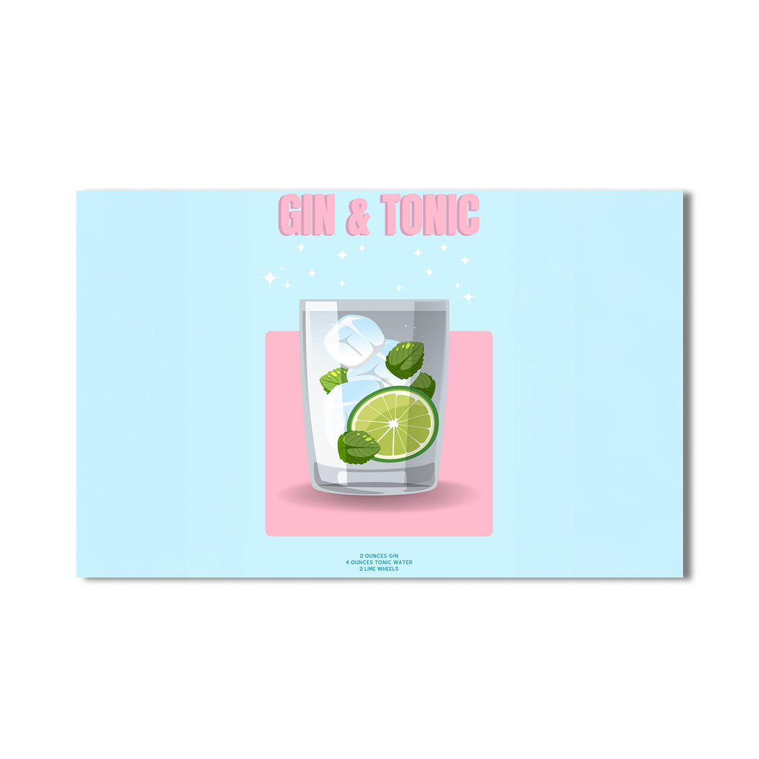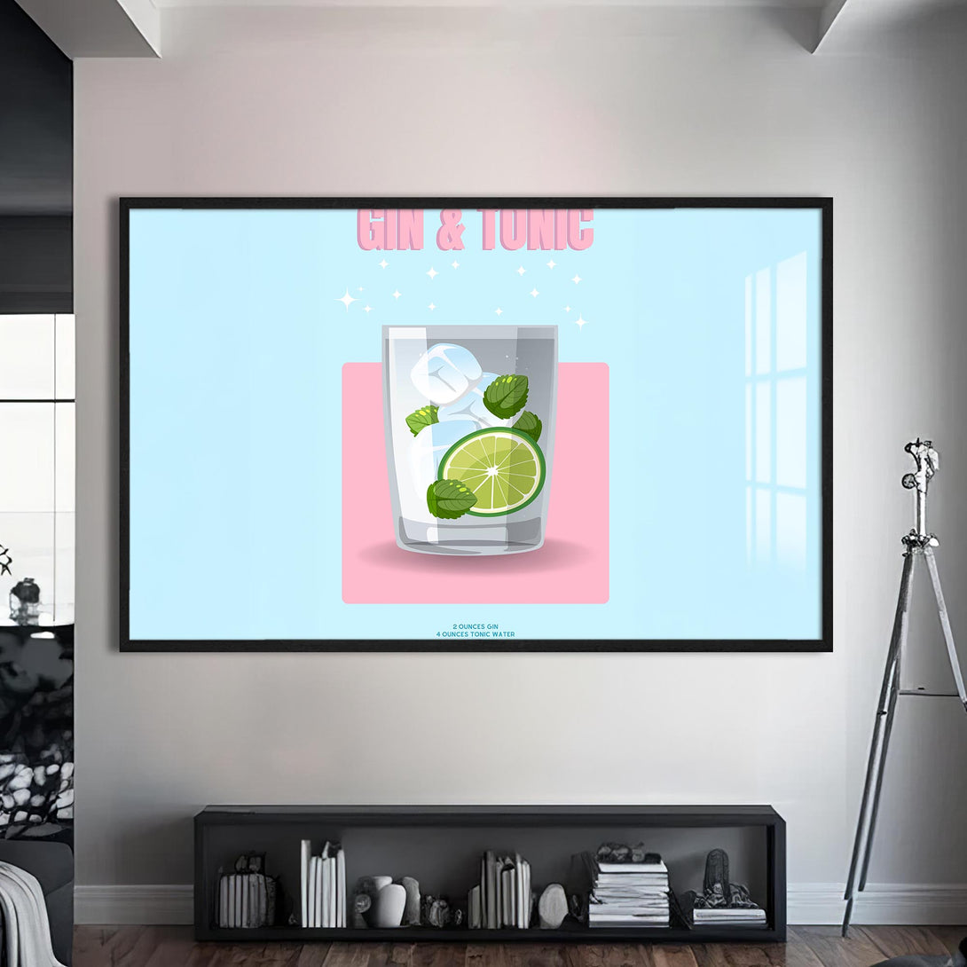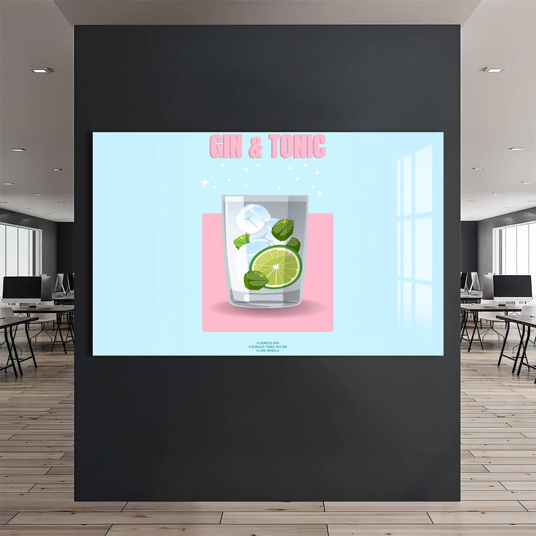 Pastel renkli zemin üzerinde narin bir bardak, lime dilimi ve nane yapraklarıyla sunulan klasik bir kokteyl: Gin & Tonic. Sadeliği ve modern tasarımıyla bu cam tablo, alkollü içecekler temalı koleksiyonlarda sade şıklığın temsilcisi.