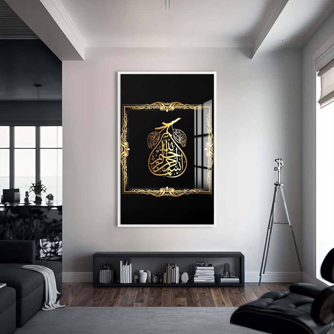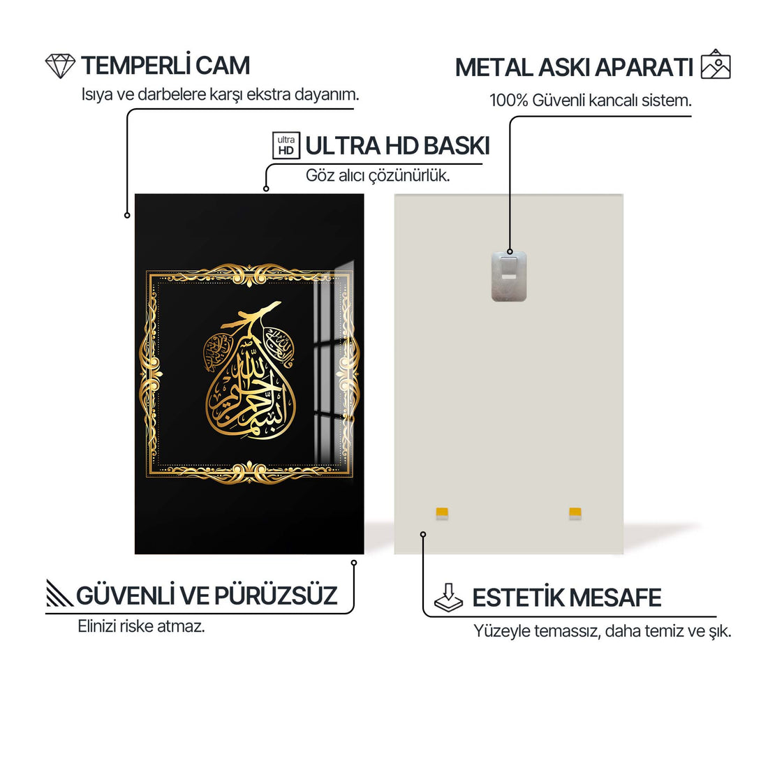 İncir meyvesi formunda stilize edilmiş “Bismillahirrahmanirrahim” hattı, bu özgün cam tablo'da manevi anlamla doğal sembolizmi birleştiriyor.
