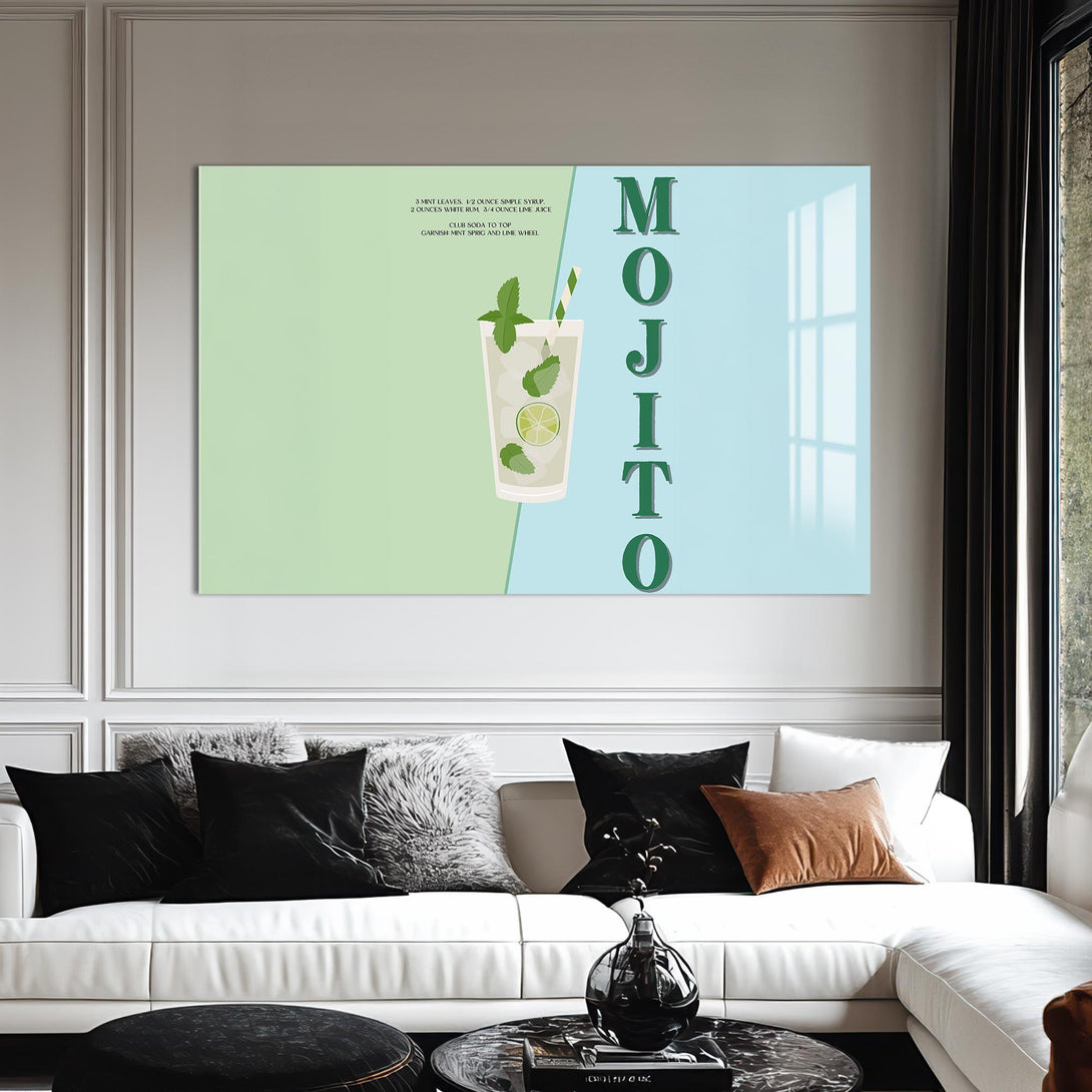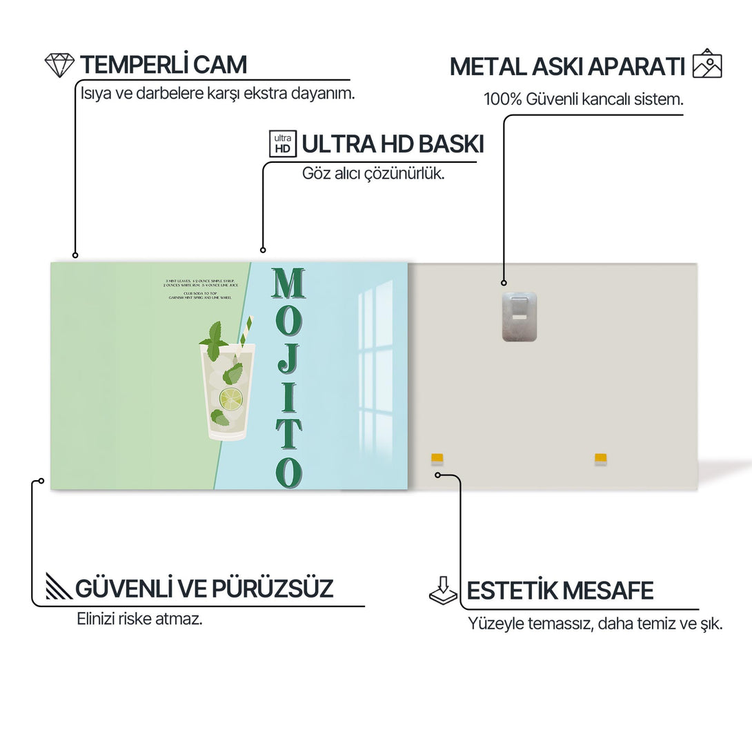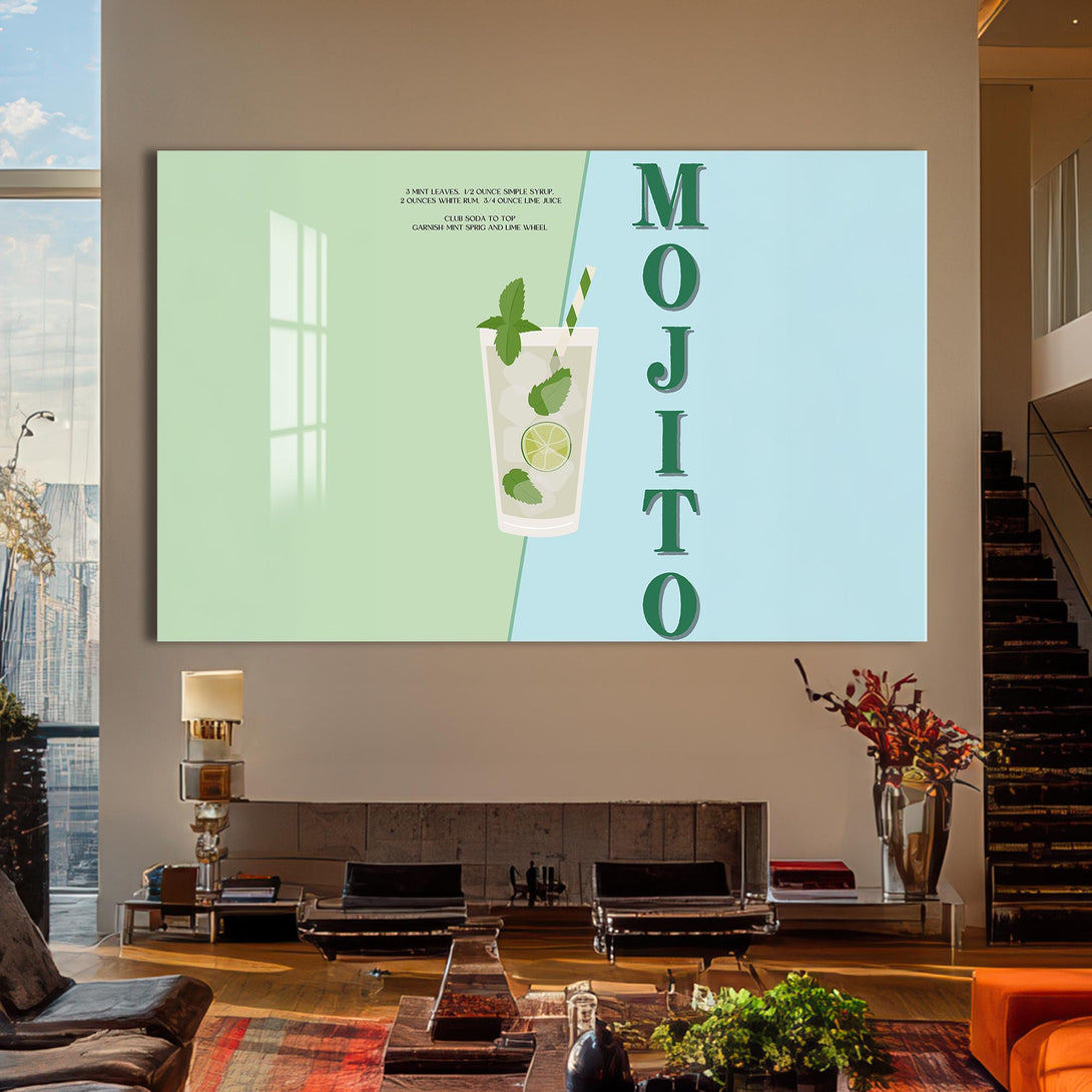 Nane, lime ve buz detaylarıyla serinlik hissi uyandıran bu cam tablo, Mojito’nun ferahlatıcı dünyasını duvarlarınıza taşır. Alkollü içecekler kategorisinin canlı ve taze görünümlü bir üyesidir.