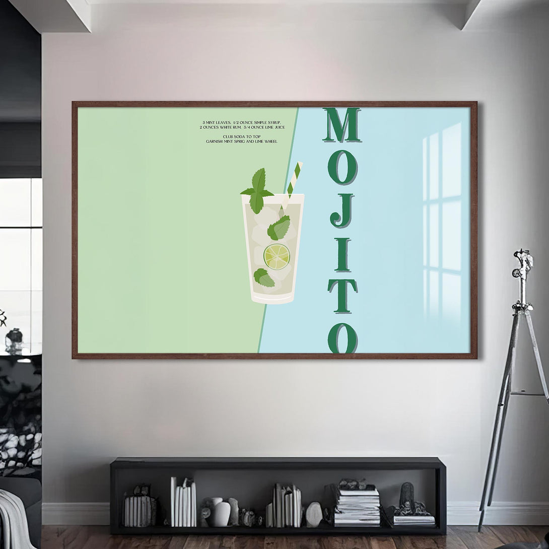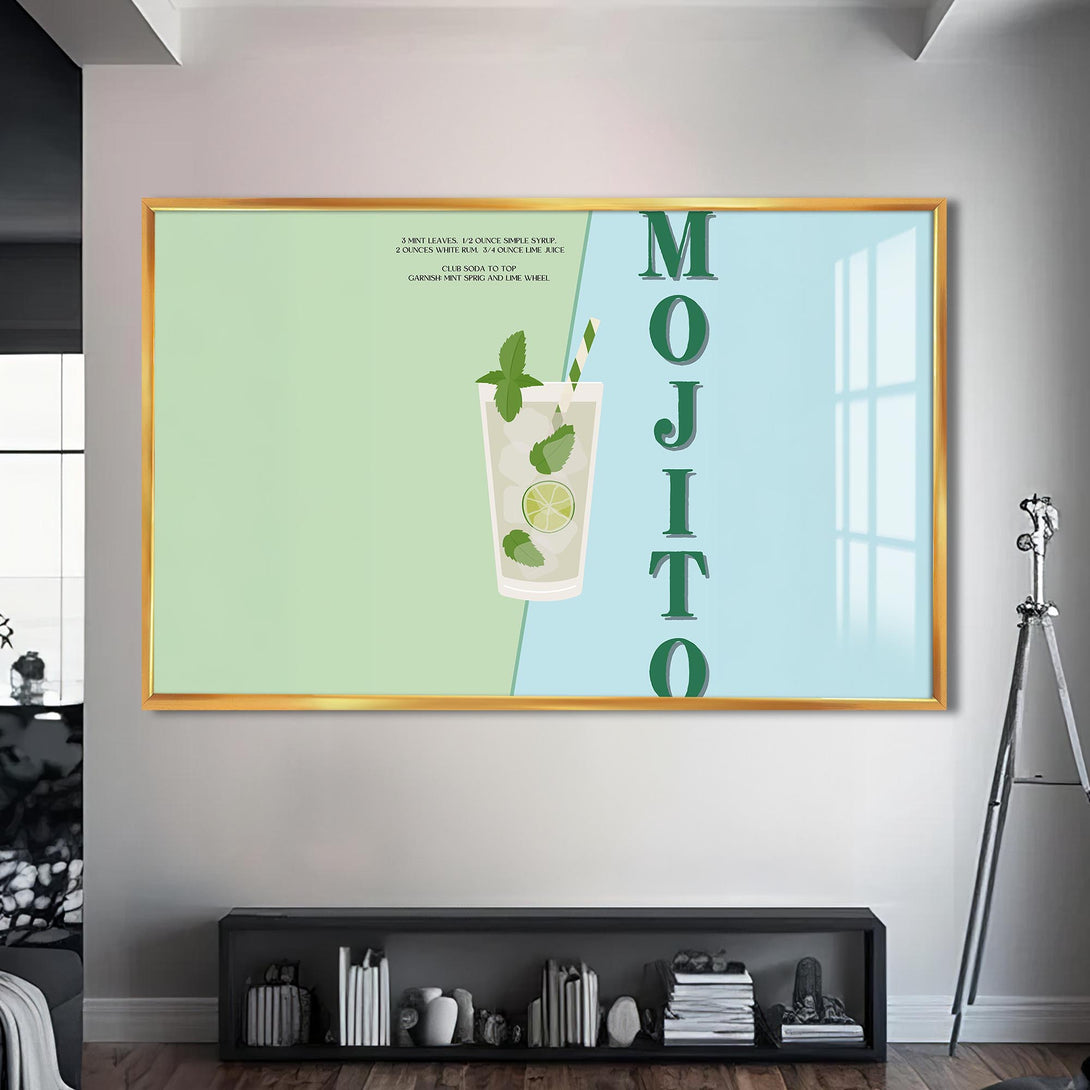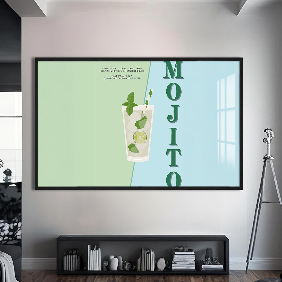 Nane, lime ve buz detaylarıyla serinlik hissi uyandıran bu cam tablo, Mojito’nun ferahlatıcı dünyasını duvarlarınıza taşır. Alkollü içecekler kategorisinin canlı ve taze görünümlü bir üyesidir.