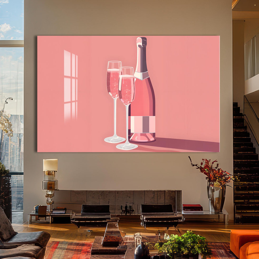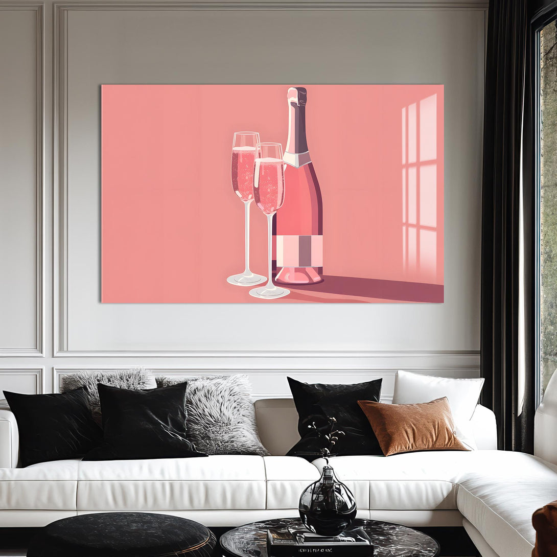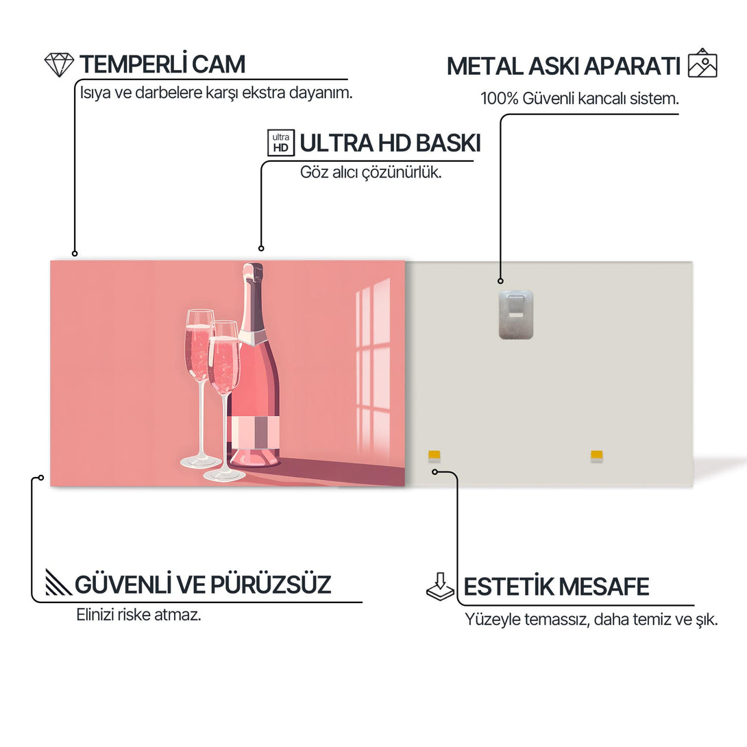 Kutlamaları simgeleyen zarif pembe şampanya şişesi ve kadehleriyle bu cam tablo, iç ısıtan anları evinize taşıyor. Özenle hazırlanmış çizim tarzı ve sıcak pembe tonlarıyla, alkollü içecekler koleksiyonunun romantik bir parçası.