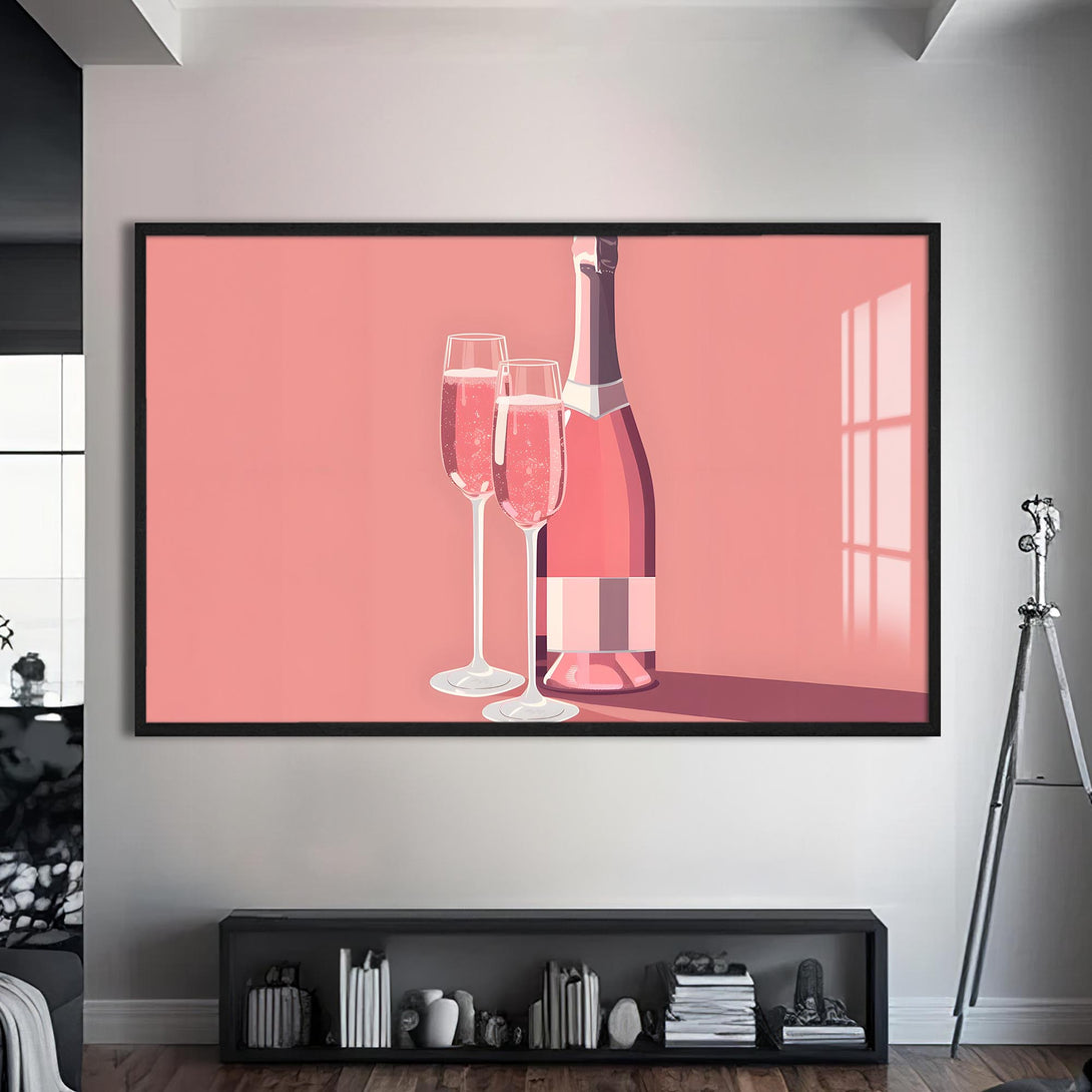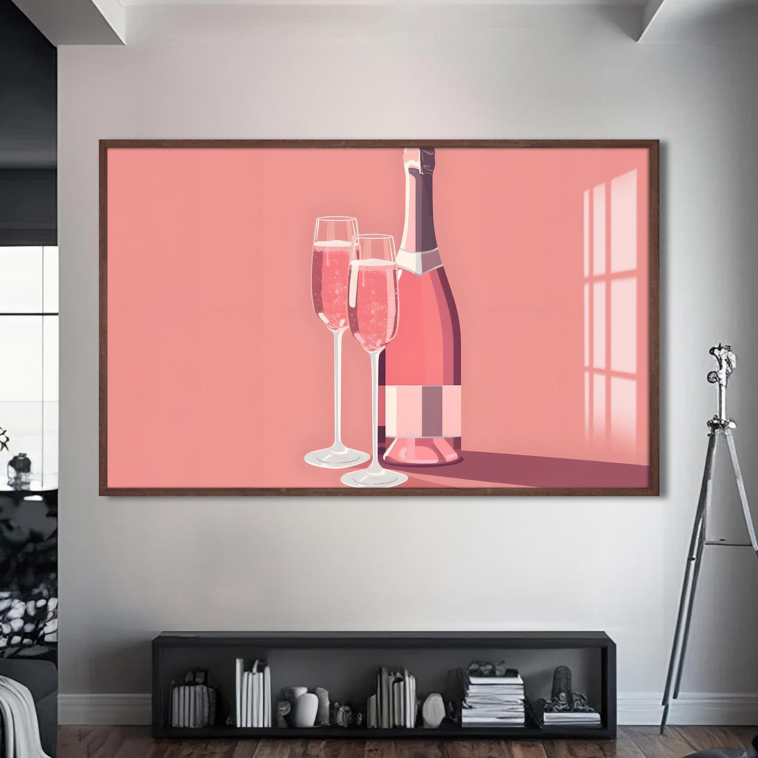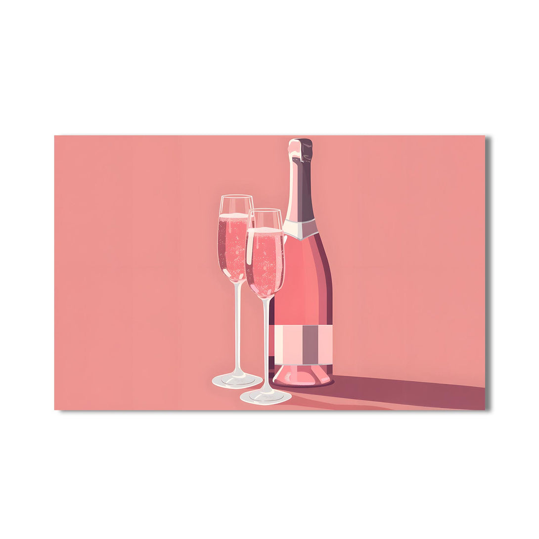 Kutlamaları simgeleyen zarif pembe şampanya şişesi ve kadehleriyle bu cam tablo, iç ısıtan anları evinize taşıyor. Özenle hazırlanmış çizim tarzı ve sıcak pembe tonlarıyla, alkollü içecekler koleksiyonunun romantik bir parçası.