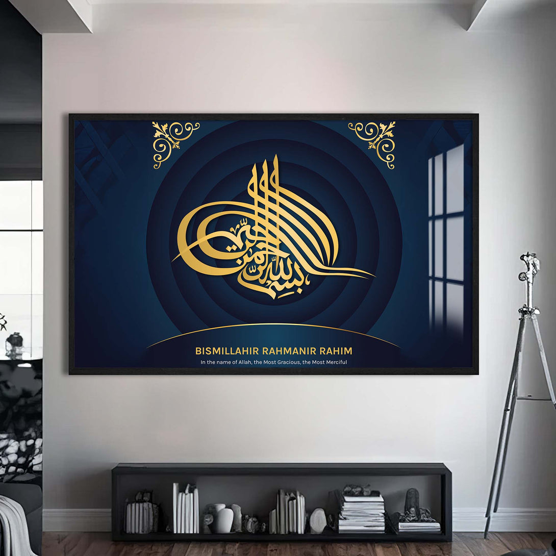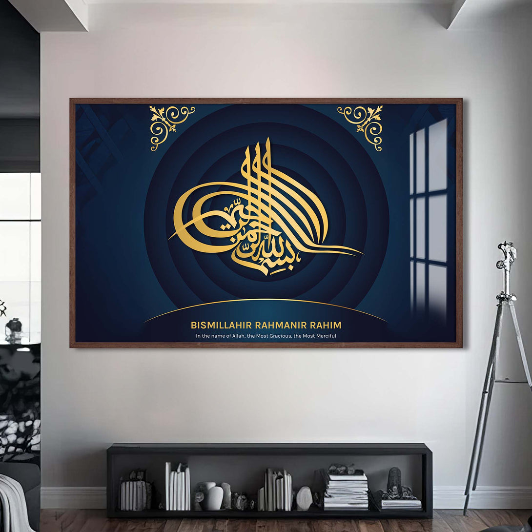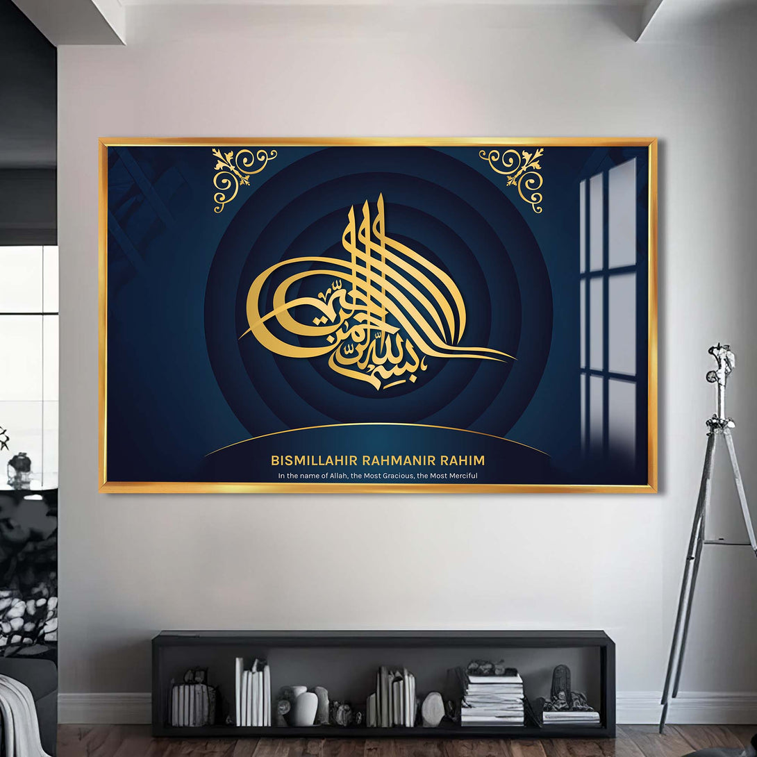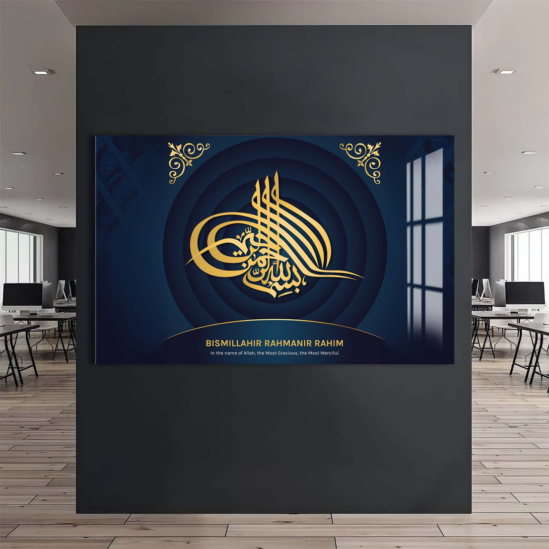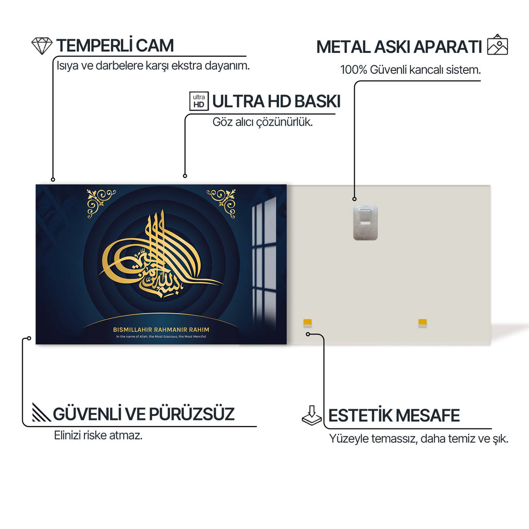 Bismillahirrahmanirrahim hattı, spiral düzen içinde derin bir kompozisyona dönüştürülerek bu cam tablo tasarlandı. Dini cam tablolar arasında eşsiz bir görsel deneyim sunar.