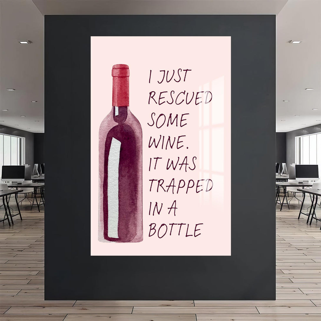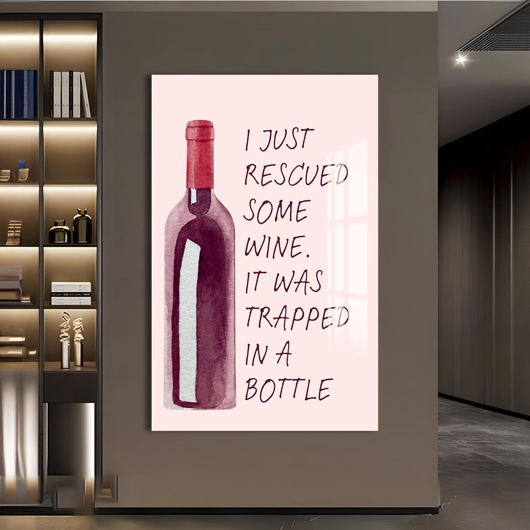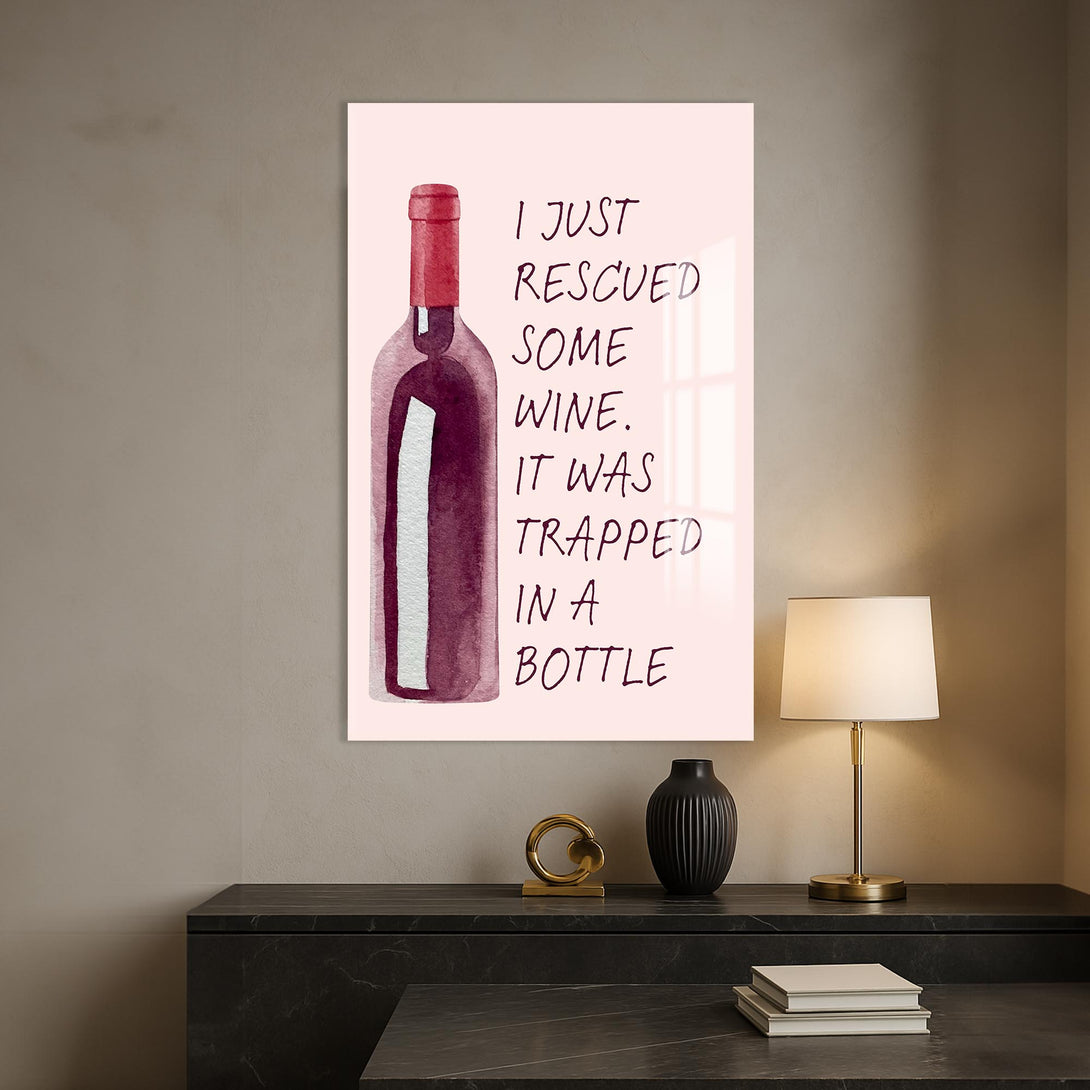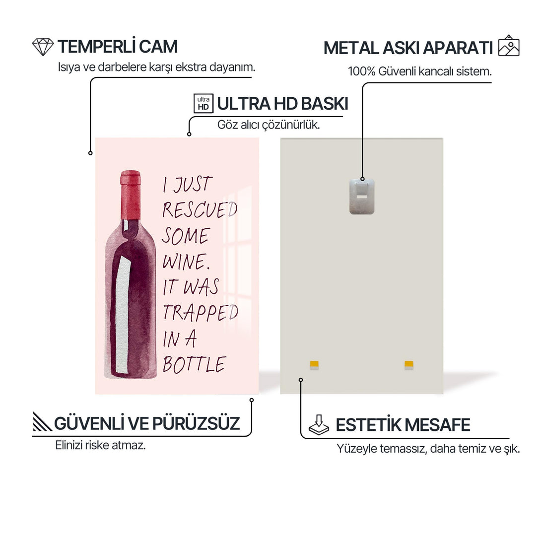 “Elimdeki şarabı kurtardım, bir şişeye hapsolmuştu” mesajıyla gülümseten bu cam tablo, sade tasarımıyla dikkat çeker. Alkollü içecekler temalı alanlarda eğlenceli bir odak noktası yaratır.