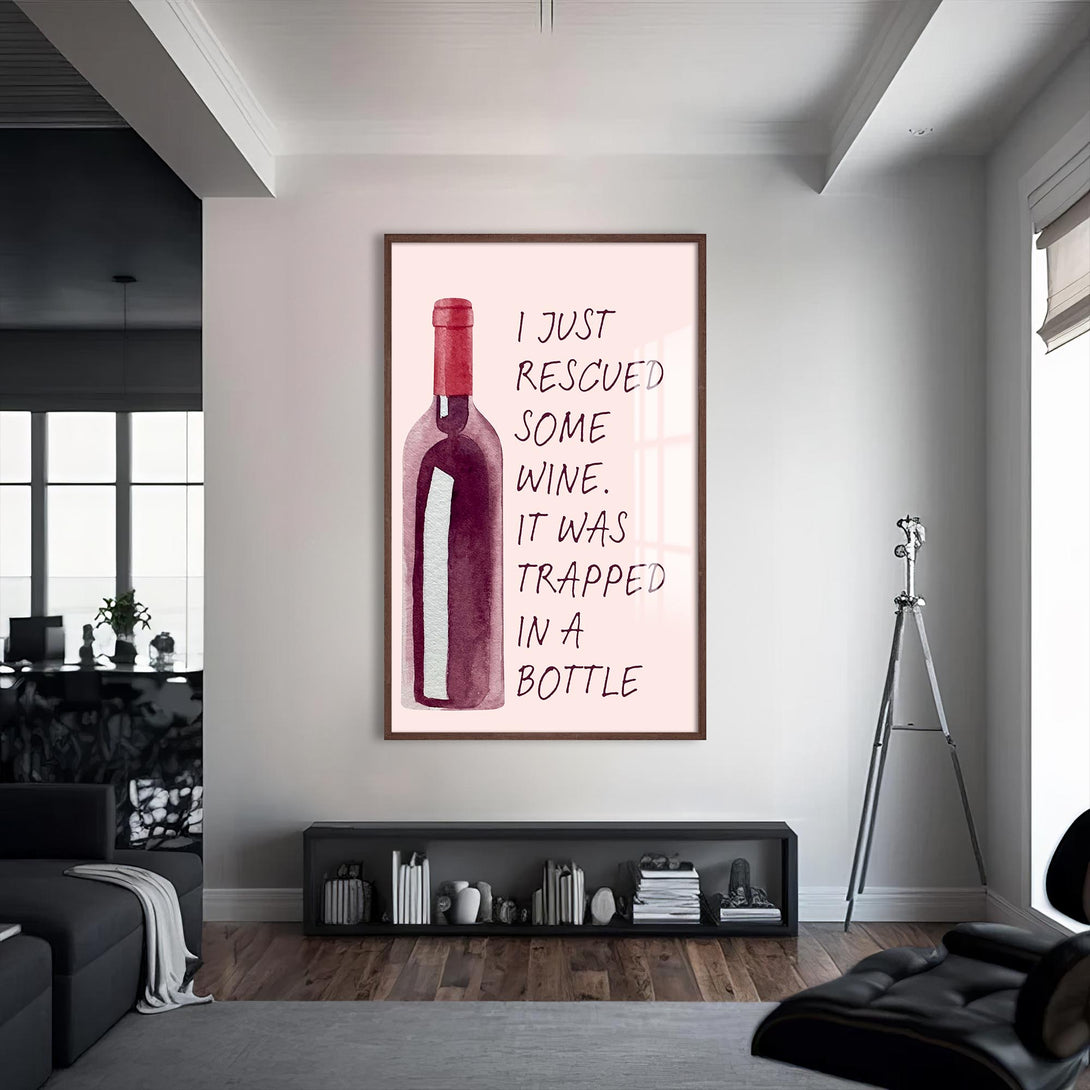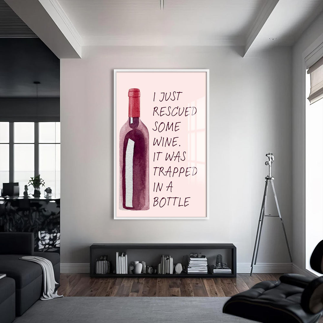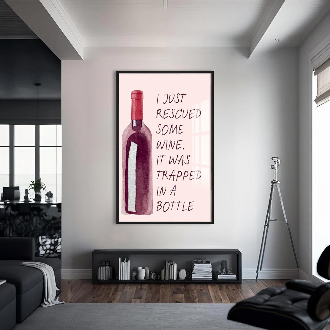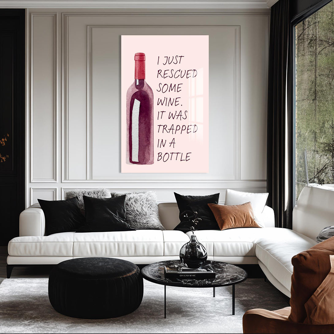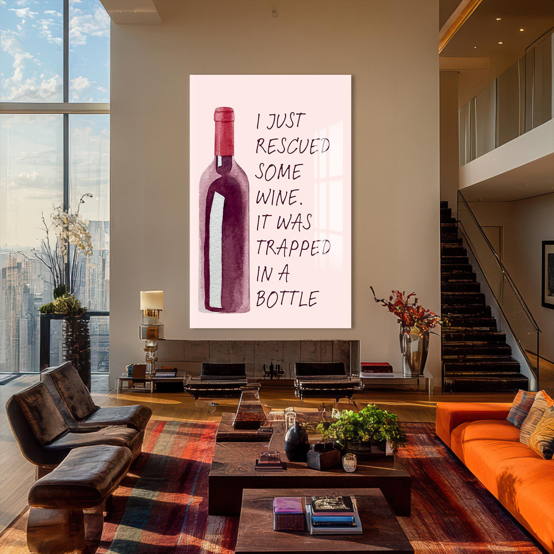 “Elimdeki şarabı kurtardım, bir şişeye hapsolmuştu” mesajıyla gülümseten bu cam tablo, sade tasarımıyla dikkat çeker. Alkollü içecekler temalı alanlarda eğlenceli bir odak noktası yaratır.