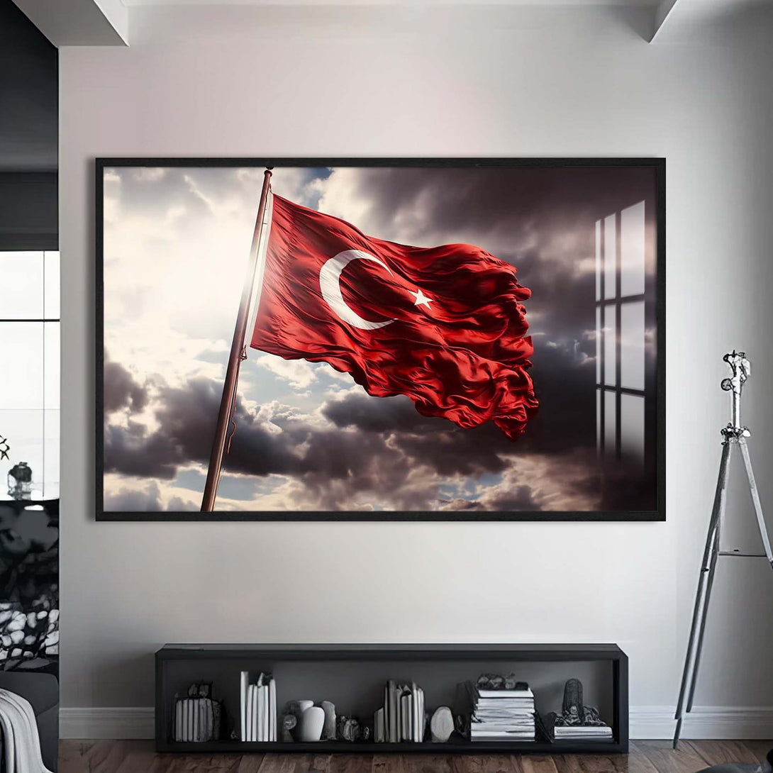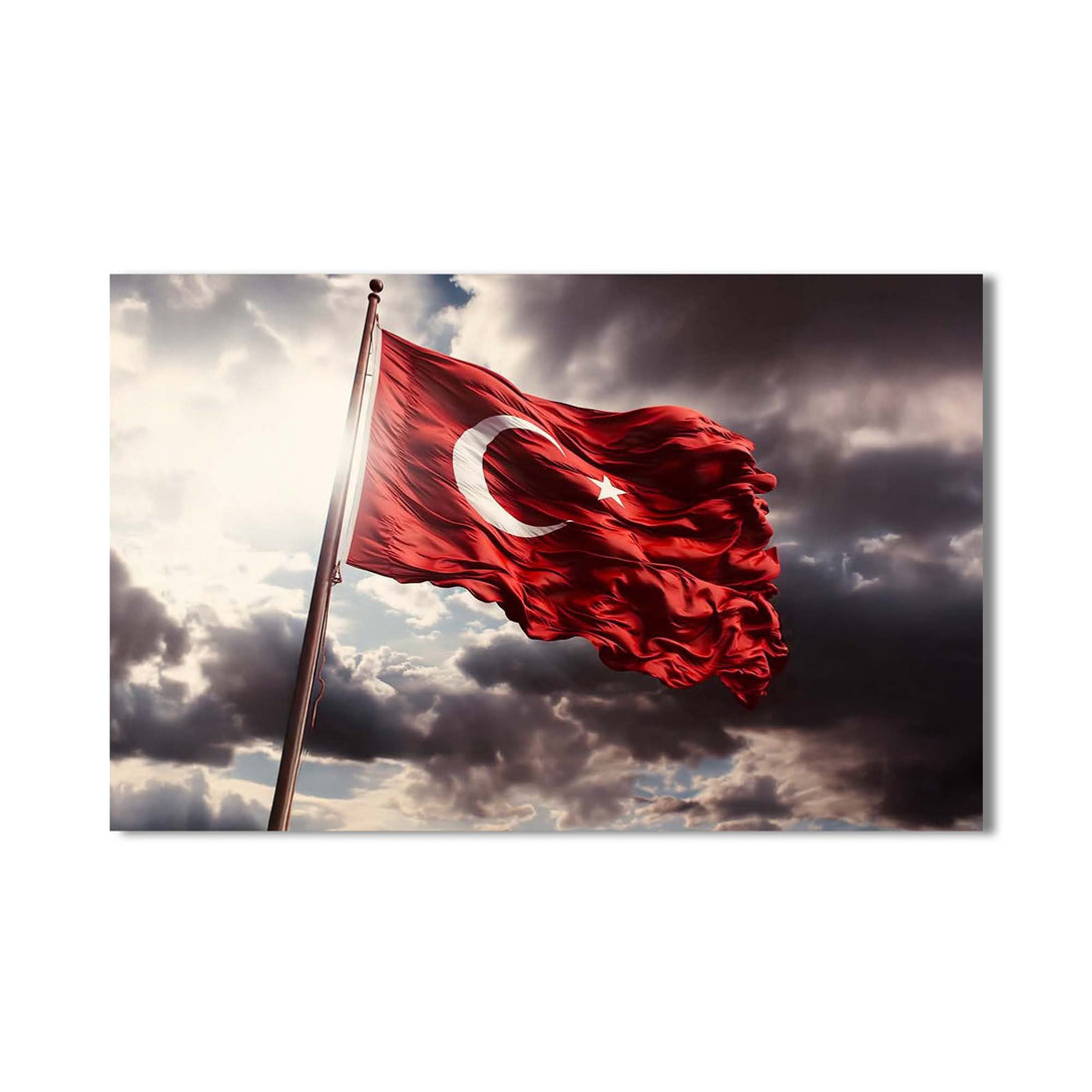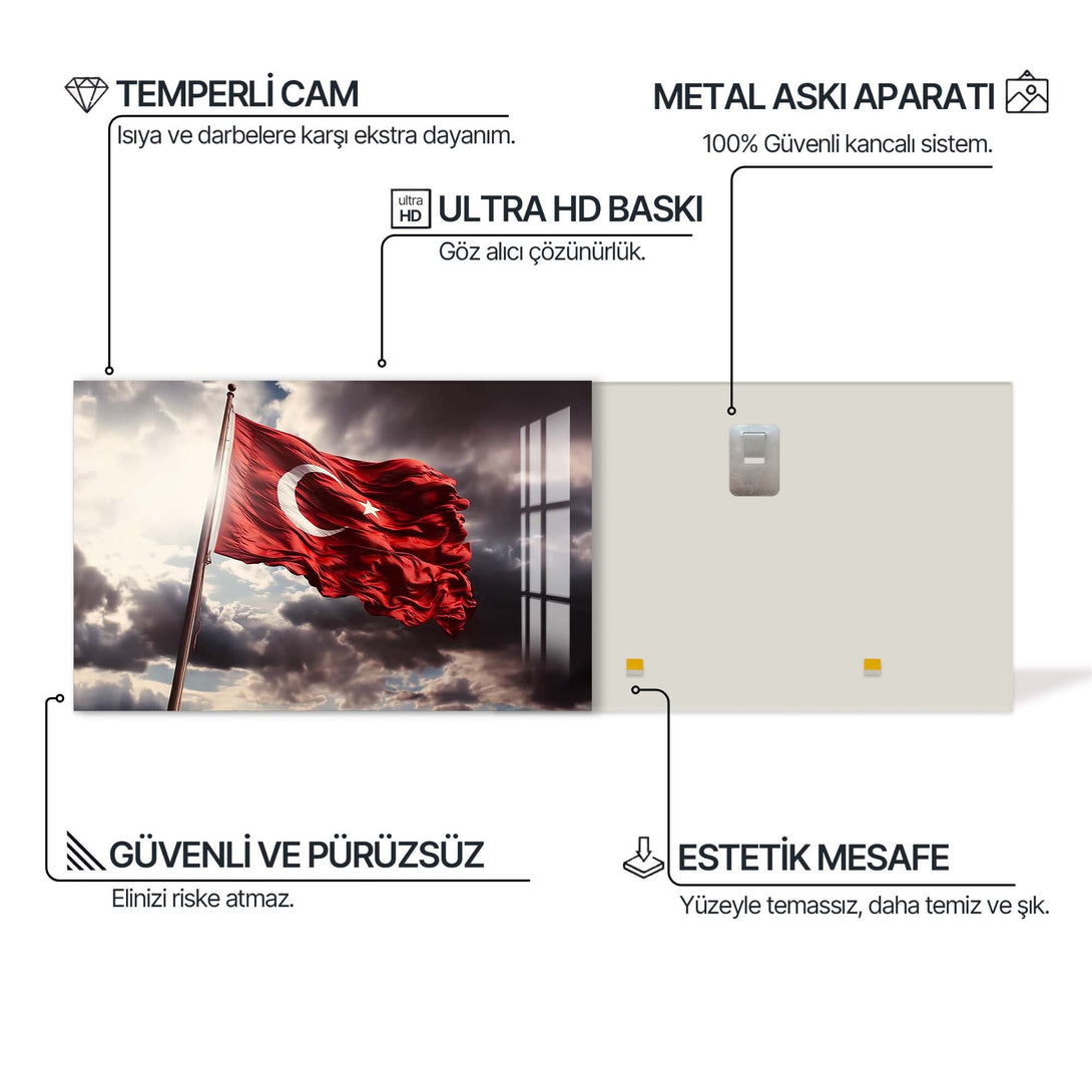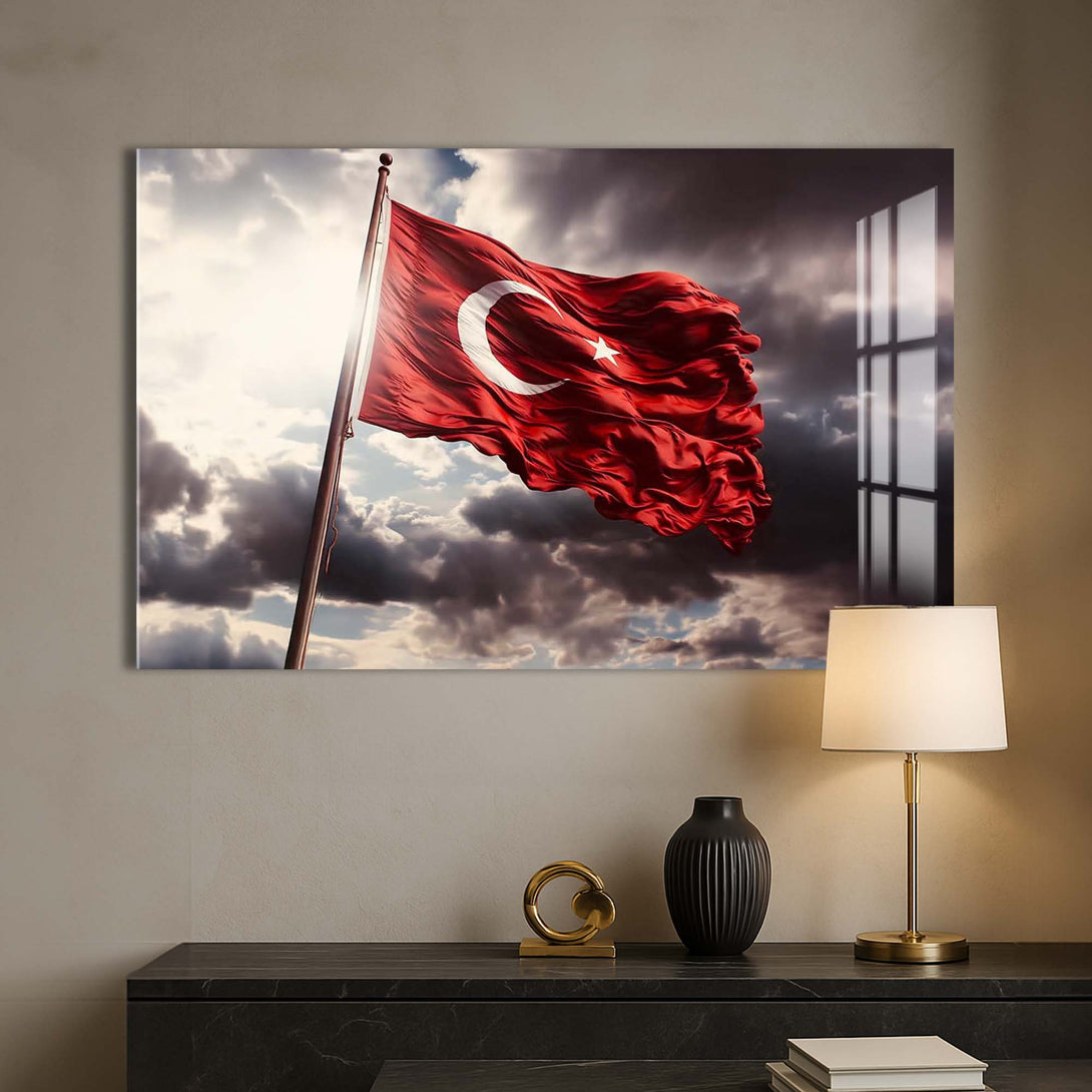 Ay yıldızlı bayrağımızın asil duruşunu cam yüzeyin zarafetiyle buluşturan bu özel tasarım, millî ruhu yaşam alanlarına taşımanın en şık yollarından biridir. Dalgalanan formu, güçlü renk kontrastı ve sade kompozisyonuyla hem geleneksel hem modern dekorasyonlara kolayca uyum sağlar.