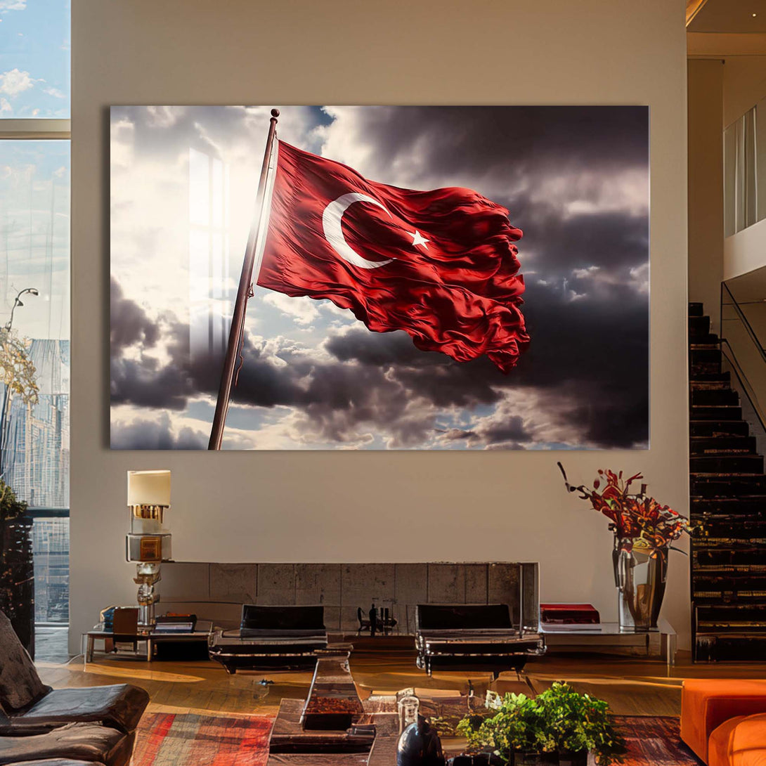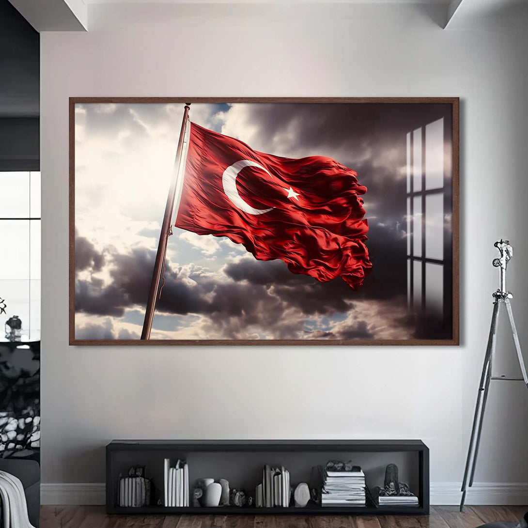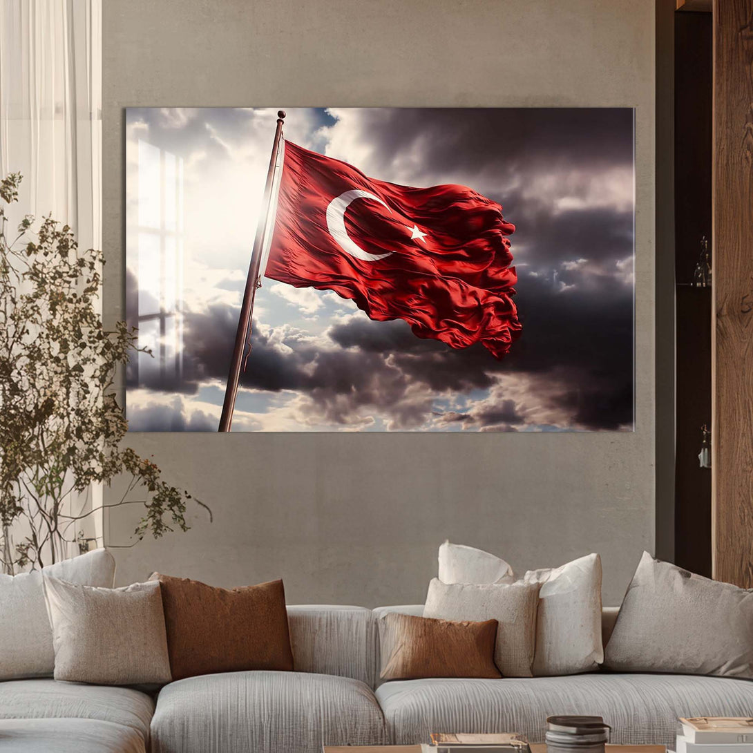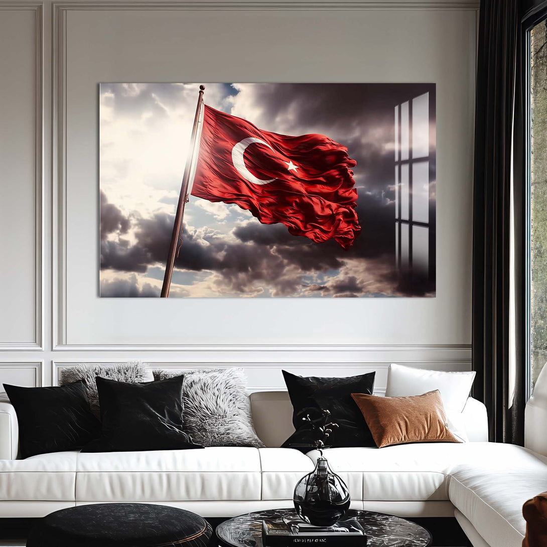 Ay yıldızlı bayrağımızın asil duruşunu cam yüzeyin zarafetiyle buluşturan bu özel tasarım, millî ruhu yaşam alanlarına taşımanın en şık yollarından biridir. Dalgalanan formu, güçlü renk kontrastı ve sade kompozisyonuyla hem geleneksel hem modern dekorasyonlara kolayca uyum sağlar.