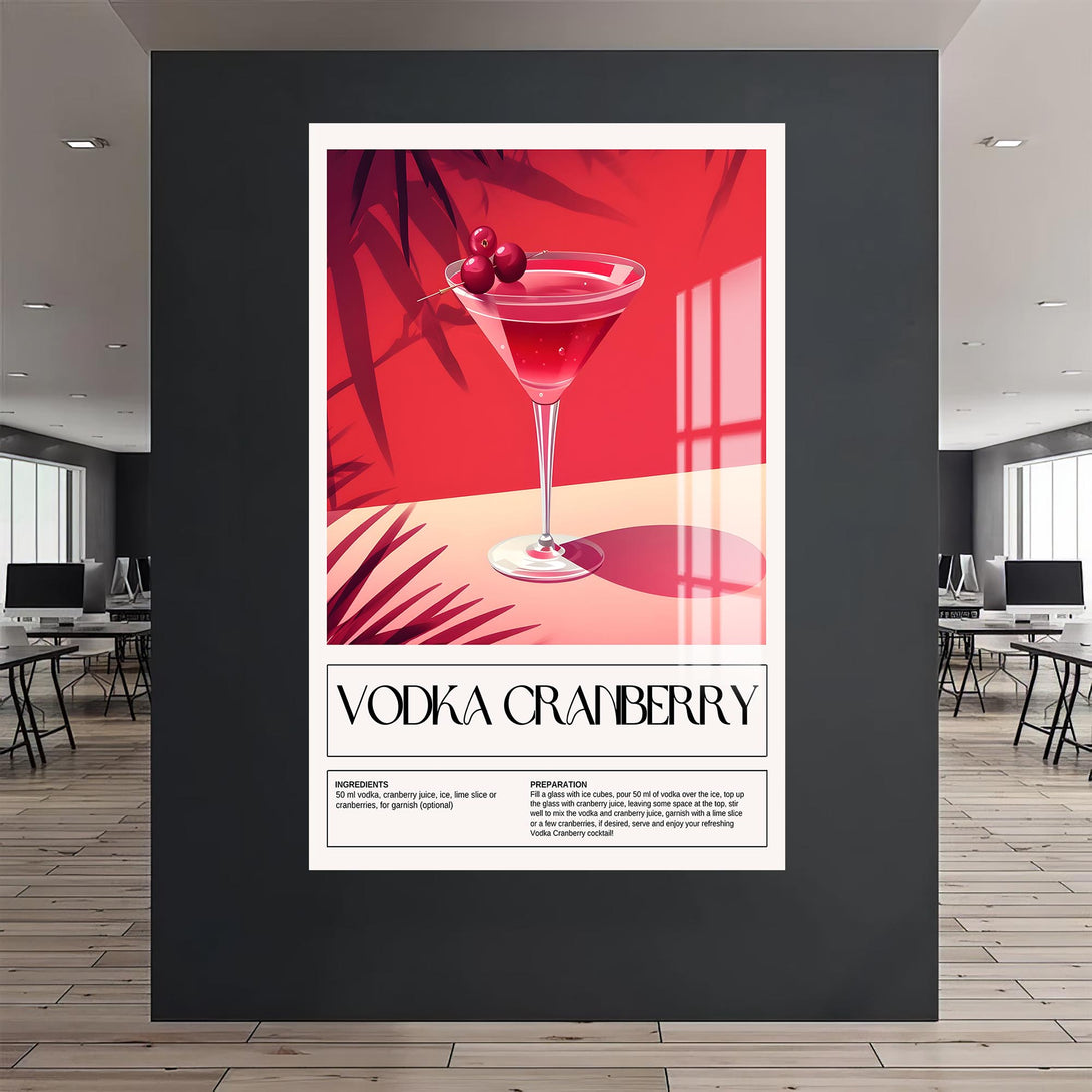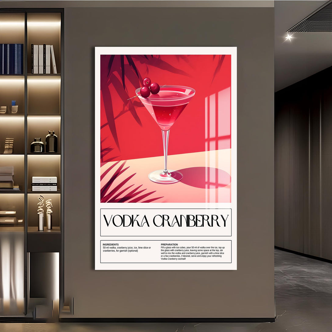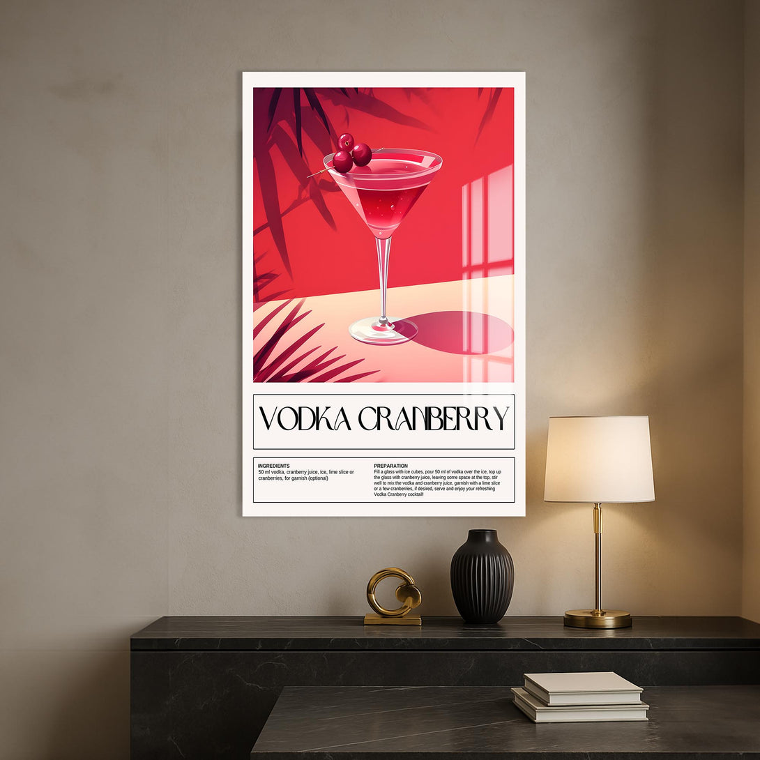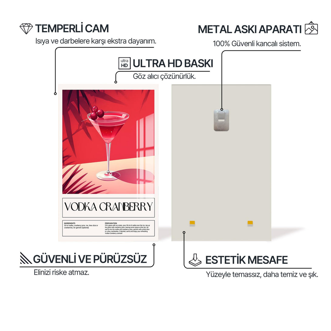 Kızıl meyve ve votka karışımının tarifsel bir illüstrasyonla işlendiği bu cam tablo, sade bir anlatımla alkollü içecekler temasını yansıtır. Hem dekoratif hem öğretici bir tarz sunar.