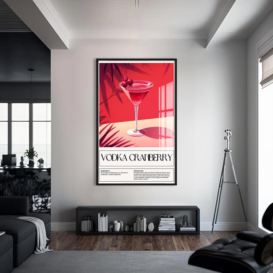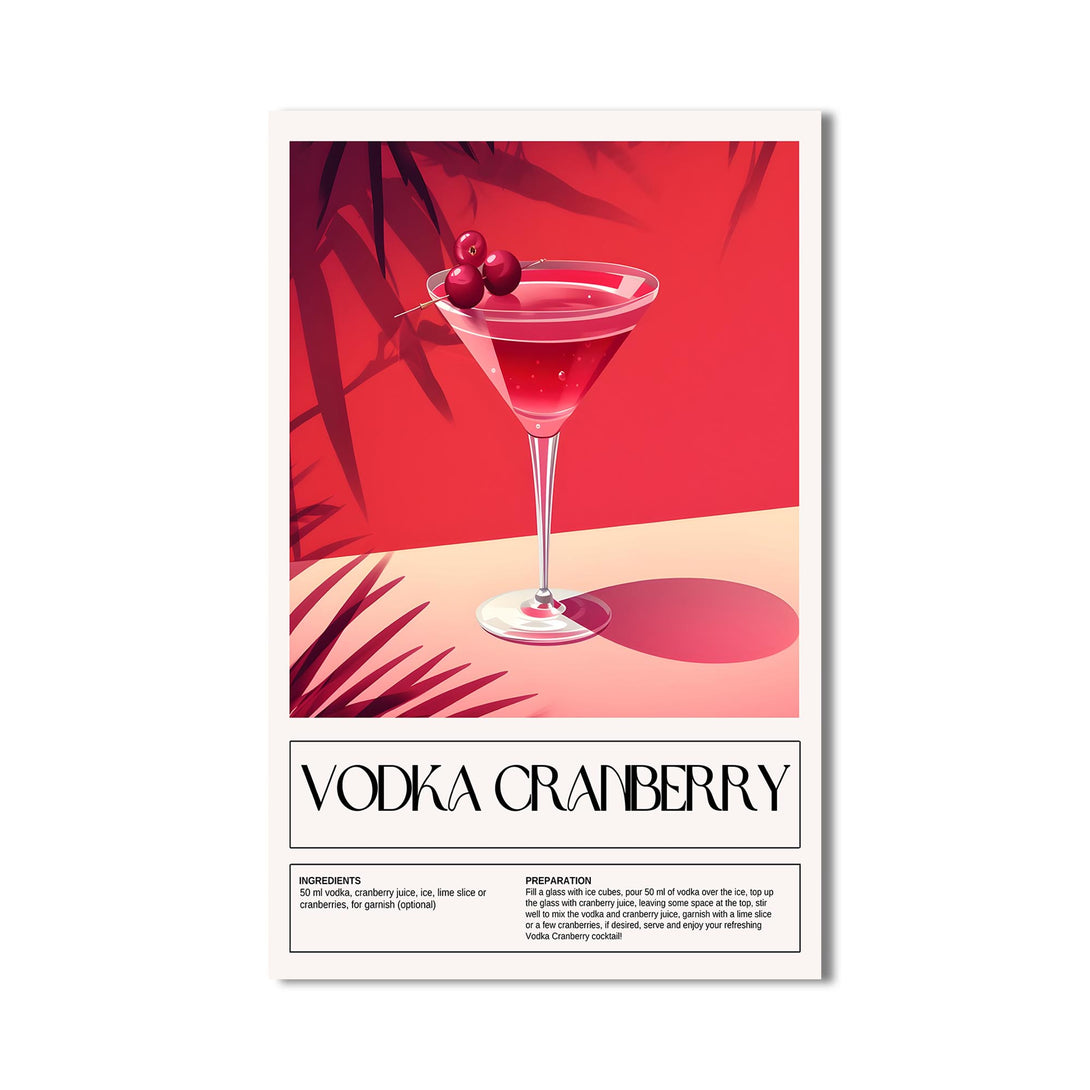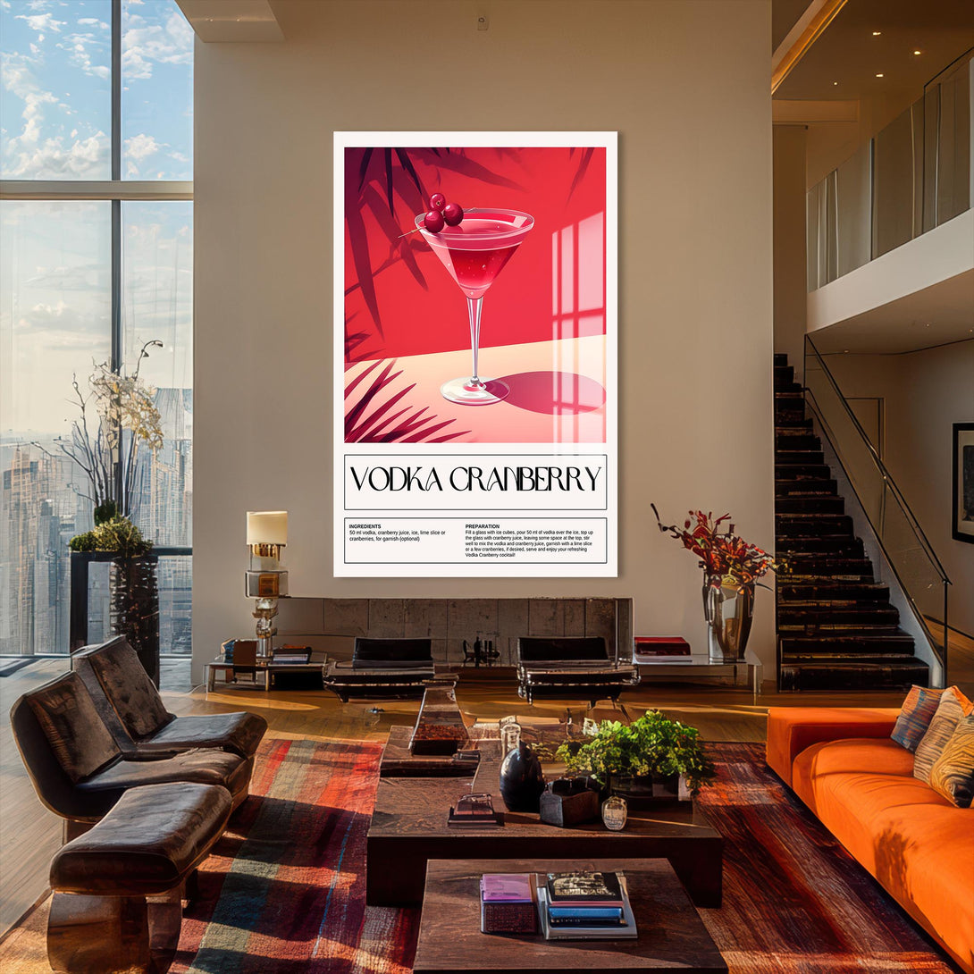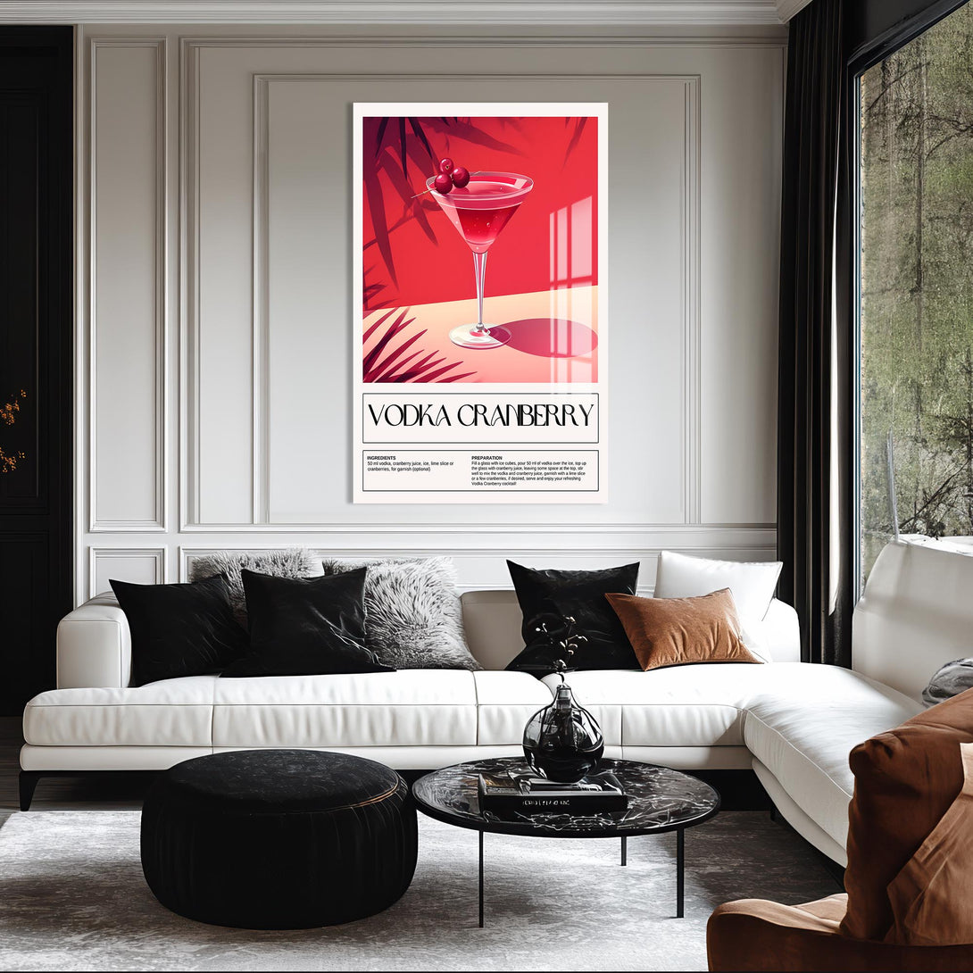 Kızıl meyve ve votka karışımının tarifsel bir illüstrasyonla işlendiği bu cam tablo, sade bir anlatımla alkollü içecekler temasını yansıtır. Hem dekoratif hem öğretici bir tarz sunar.